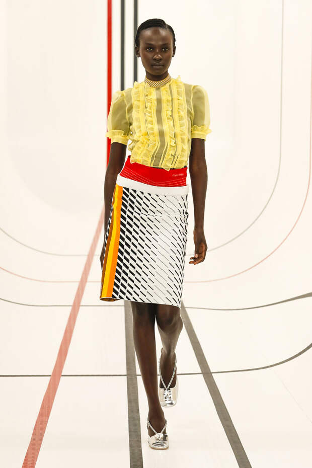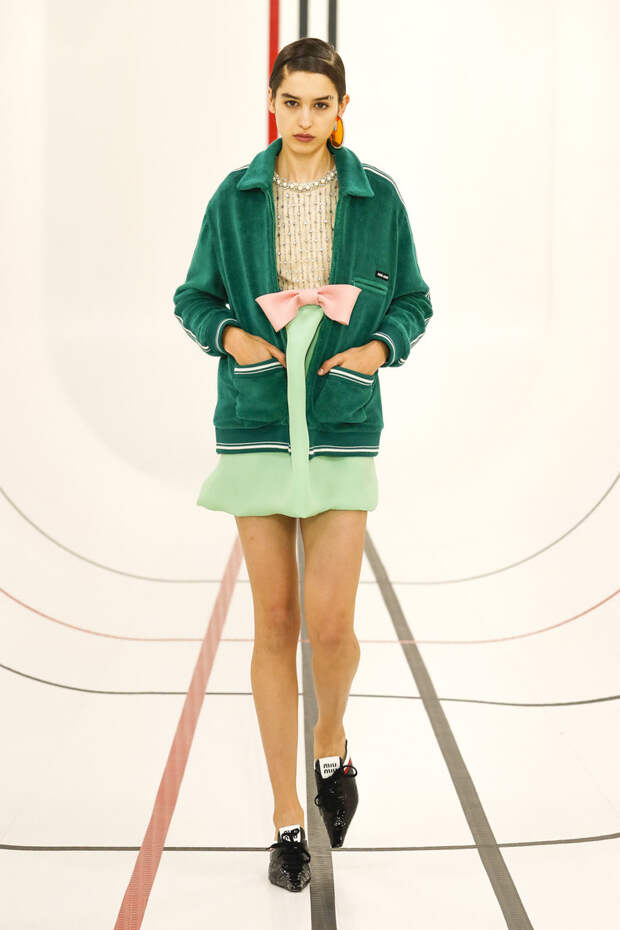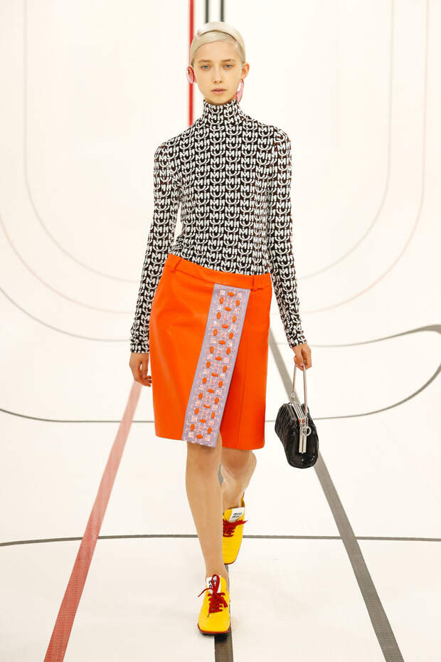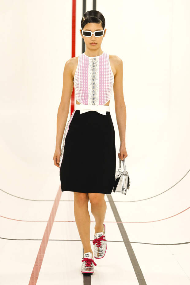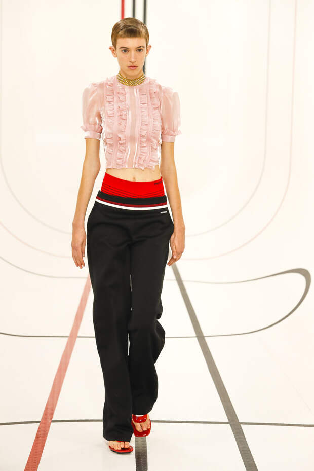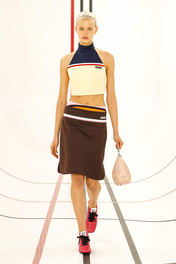 И даже обувь в этот раз абсолютно парадоксальна: где вы еще видели футбольные бутсы на каблуках?Сам показ получил название "Вымышленный дворец спорта". И он буквально проходил в спортивном зале. Но вот как раз у спорта и моды противоречий не так много, как может показаться. Помимо того, что известные дизайнеры часто делают форму для спортсменов (сама Прада тоже не раз этим занималась), обе сферы объединяет одно: они не существуют без наблюдателей. И модный показ, и спортивное соревнование теряют всякий смысл без зрителей. И, по иронии судьбы, именно их они и лишились в результате пандемии. В итоге и те, и другие мероприятия проводятся в пустых залах (еще один оксюморон!). Спасибо современным технологиям за то, что мы можем приобщиться к ним без перемещений в пространстве — прямо из дома. Поэтому показ в абсолютно пустом зале на самом деле видели миллионы людей по всему миру — с экранов своих гаджетов (снова противоречие!). Впрочем, разного рода дихотомии и единства противоположностей — основа подхода Прады к дизайну. Обе ее марки крепко стоят на ее виртуозном умении сочетать несочетаемое. А в нынешних реалиях это еще и самая настоящая новая норма.
