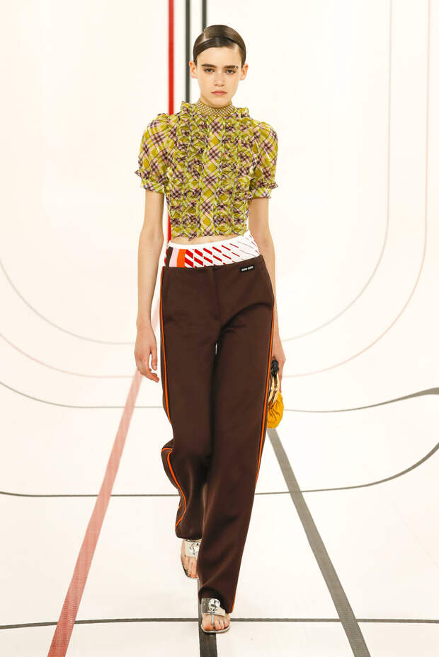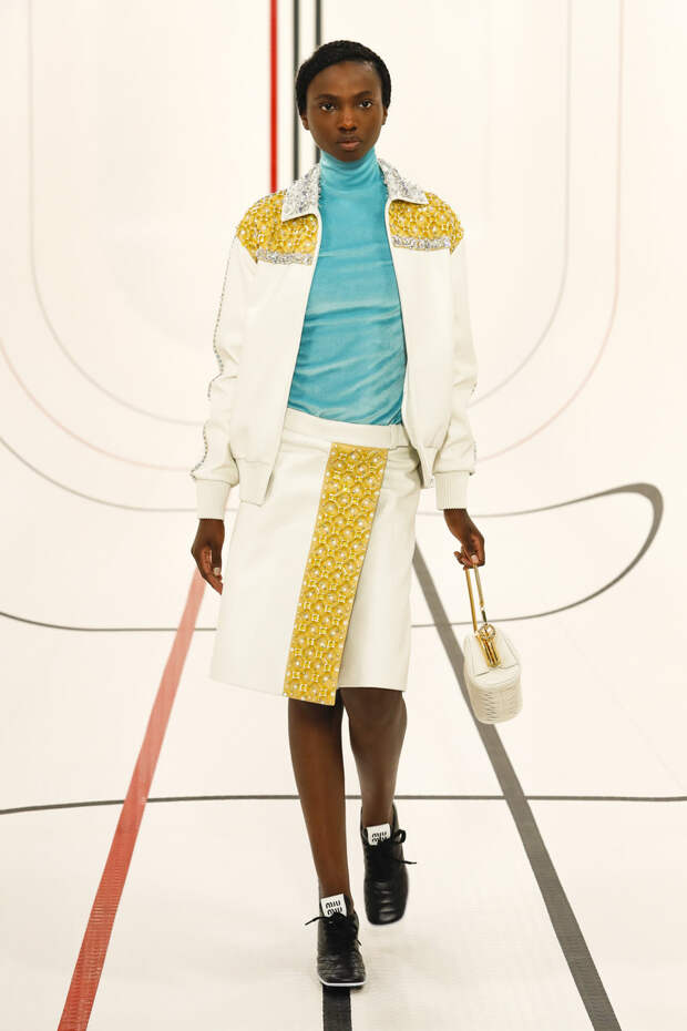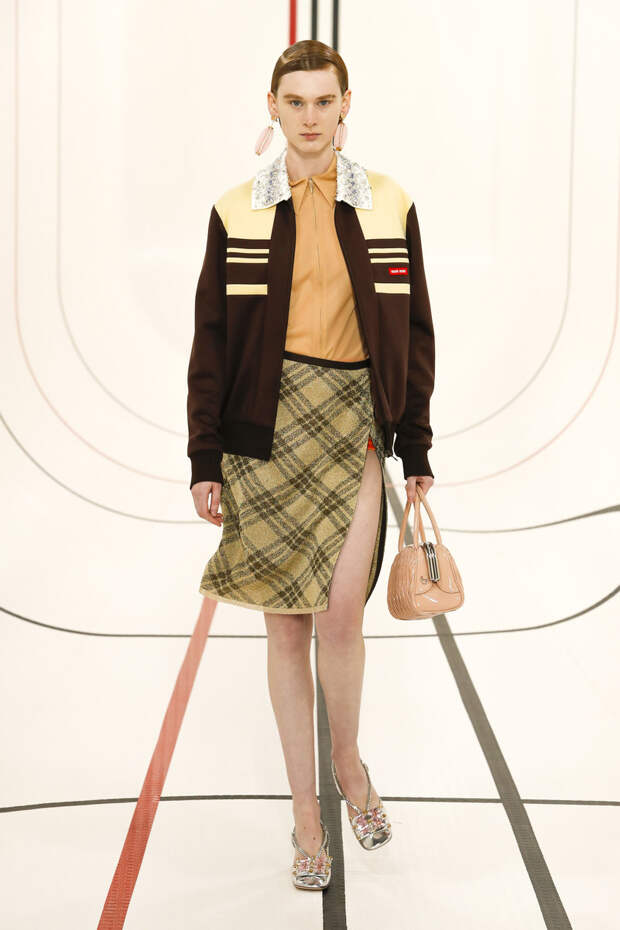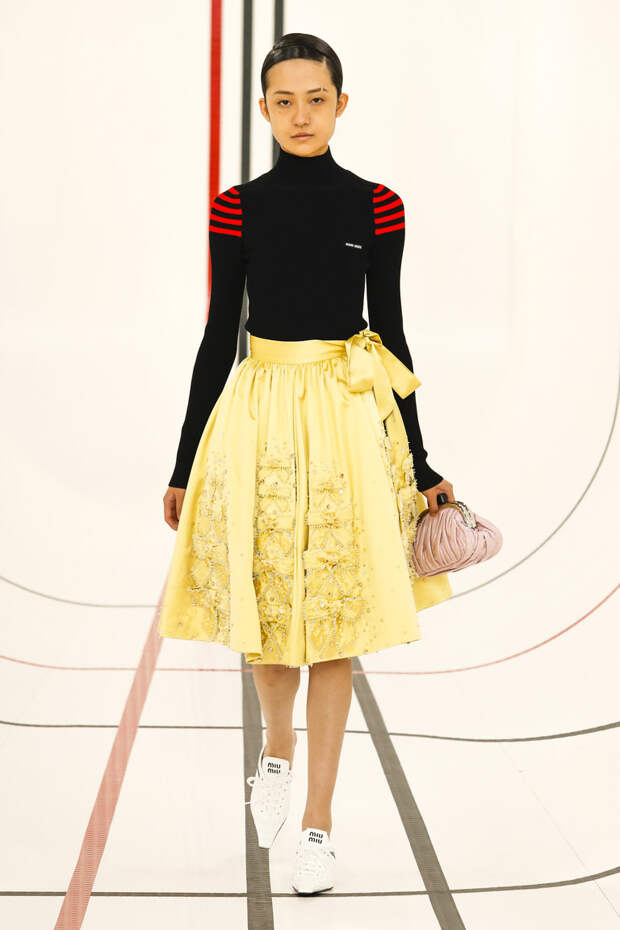 Мы живем в очень противоречивые времена. Времена, когда не видеться лишний раз с близкими — значит показать свою любовь и заботу. Когда избегать объятий и рукопожатий при встрече — это новый этикет. Когда правила негласного приличия предписывают общаться с собеседником в маске. Одним словом, когда все в одночасье перевернулось с ног на голову. Именно это и хотела показать в новом шоу Miu Miu синьора Прада. "Эта коллекция о полярности — мы живем в полярные времена. Все противоположно друг другу. Спортивная и вечерняя одежда, момент реальности, момент фантазии. В жизни нужно и то, и другое", — прокомментировала сама дизайнер свое последнее шоу. И все увиденное на подиуме — действительно одно сплошное единство противоположностей. Физический показ, но без зрителей. Утилитарность спортивной одежды встречается с декоративностью вечерней. Маскулинность спортивных костюмов и угловатых жакетов — с женственностью пышных юбок и коктейльных платьев в пастельных оттенках.