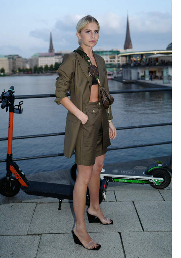 Оливковый, темно-зеленый, хаки - любимые оттенки звезд стритстайла. Во время недель моды костюм в этой гамме можно было заметить на каждой второй гостье показов. Девушки отдают предпочтение брючным двойкам самых разных фасонов: приталенный жакет с широкими брюками, шорты с удлиненной рубашкой или клеш, как у Беллы Хадид.