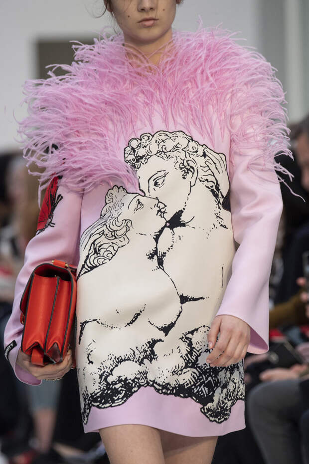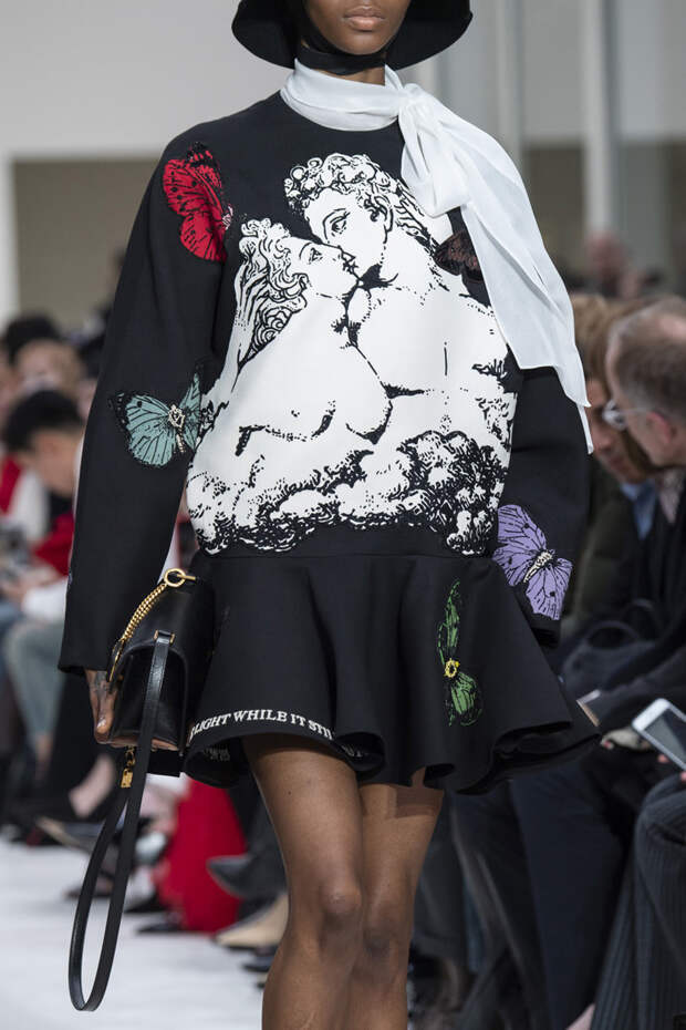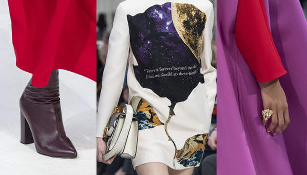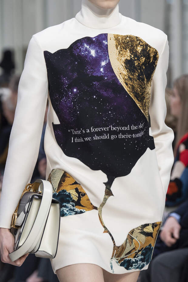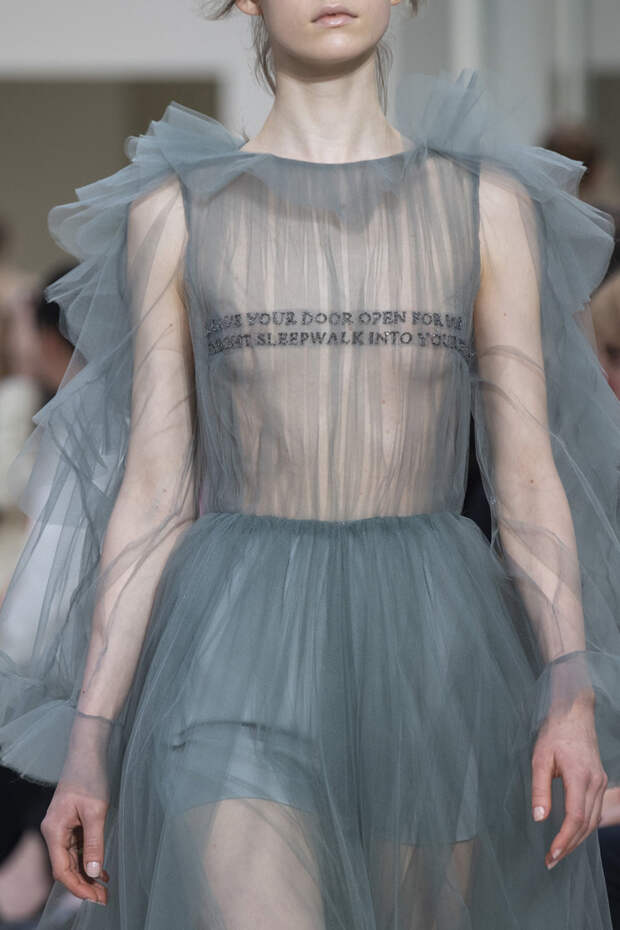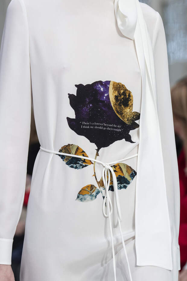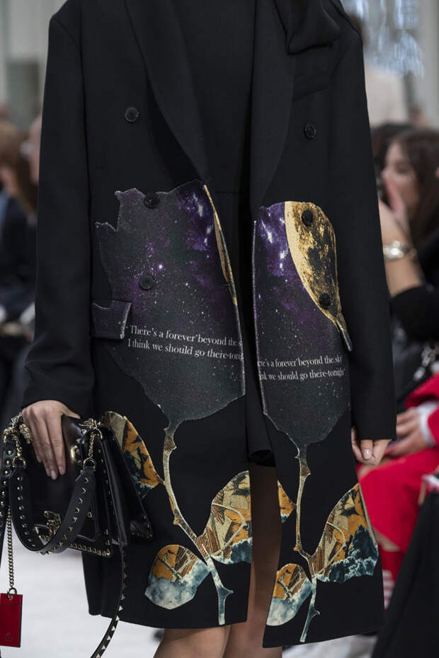 Вчерашний показ Valentino до мих пор не выходит у нас из головы. В качестве декорации Пьерпаоло Пиччоли использовал работу художника Роберта Монтгомери, — святящуюся надпись "The people you love become ghosts inside you and like this you keep them alive" — в качестве саундтрека — стихи о любви. А какие-то романтичные строки заодно вынес и на одежду: платья, юбки и даже шубы.