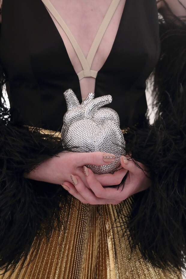 Присоединился к импровизированному «флэшмобу» и Алессандро Микеле. Но он, впрочем, всегда чувствовал себя в этой теме, как рыба в воде: чего стоят одни только «отрубленные» силиконовые головы и драконы в руках моделей на осенне-зимнем показе Gucci 2018 года! В этом сезоне на смену головам пришли сердца — точнее, клатчи-минодьеры в их форме, усыпанные сияющими разноцветными кристаллами. Финал фильма-показа Gucci Aria тоже вышел весьма сюрреалистичным: в нем модели вместо с экзотическими животными вдруг начали взлетать в воздух прямо посреди райского сада. Чудеса, да и только.