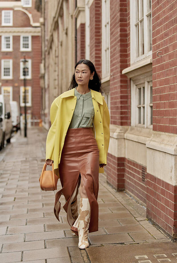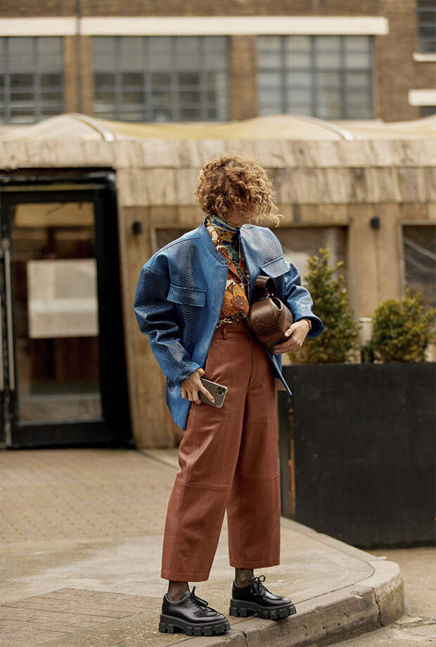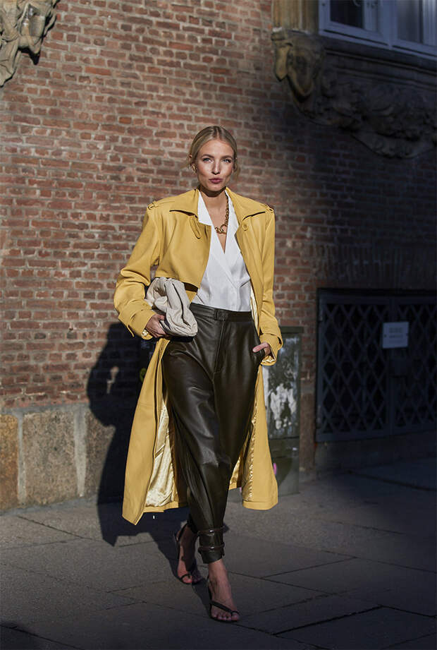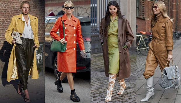 Еще один вариант – носить акцентную вещь из искусственной кожи, дополняя ее маленькой «изюминкой». Посмотрите, как это делают героини стритстайла: приправляют морковный плащ из эко-кожи поясной сумкой оливкового оттенка. Однако бояться ярких сочетаний тоже не имеет смысла. Стоит взглянуть на модниц: они с легкостью комбинируют серо-голубые ботфорты с кожаными брюками карамельного оттенка. Как насчет ярко-оранжевой юбки миди в сочетании с баклажановым жакетом «с мужского плеча». Если вам кажется, что это чересчур ярко, спешим разубедить – вдохновитесь нашей подборкой ниже.