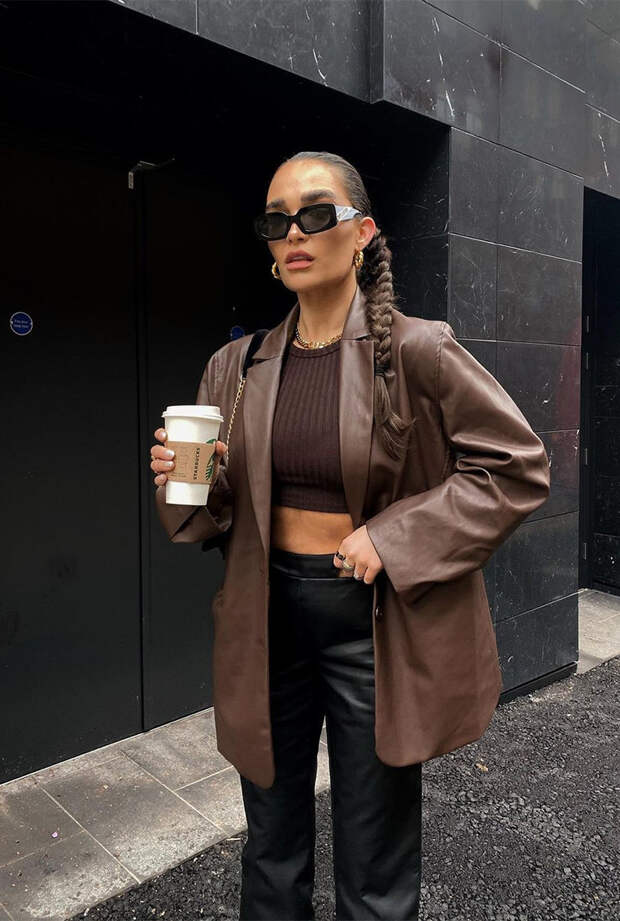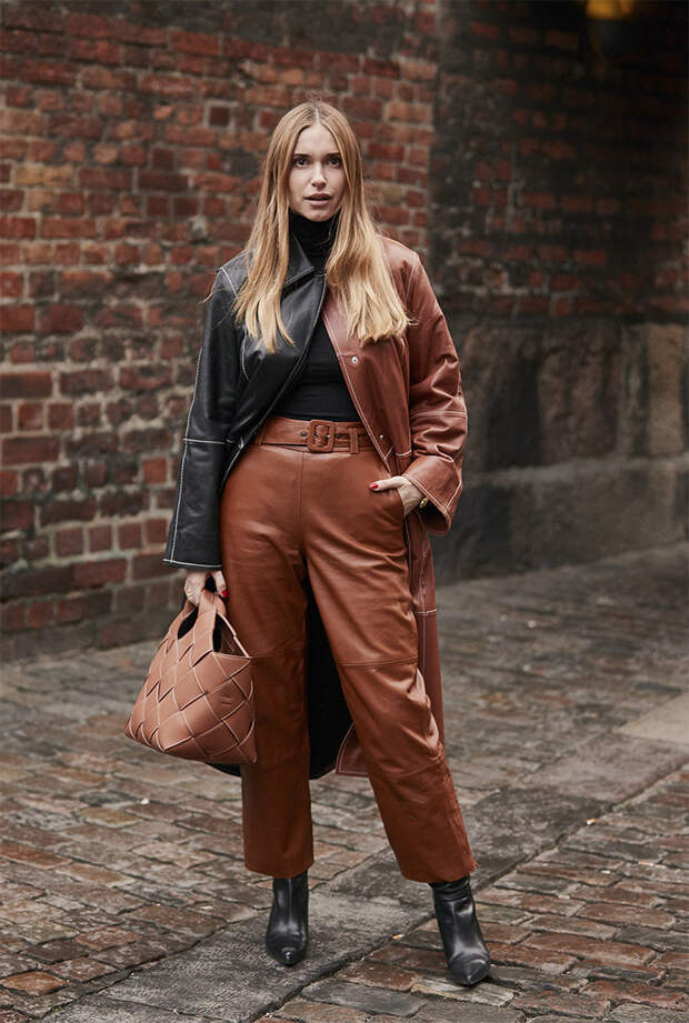 Играем по-крупному и облачаемся в «кожу» полностью.Как насчет того, чтобы сочетать брутальные вещи разных оттенков? Не пугайтесь, этот тренд с нами уже давно – кто не носил кожаные ботильоны с сумкой другого цвета? И хотя сегодня мы можем позволить себе более смелые комбинации, формула остается примерно такой же. Для тех, кто пока сомневается в своих модных способностях, есть вариант: сочетайте в одном образе спокойные оттенки эко-кожи – к примеру, черный и коричневый. Смело надевайте черный кожаный тренч с шоколадными брюками и такой же сумкой. Убиваем двух зайцев – спокойный и неброский образ, но его хочется рассматривать.