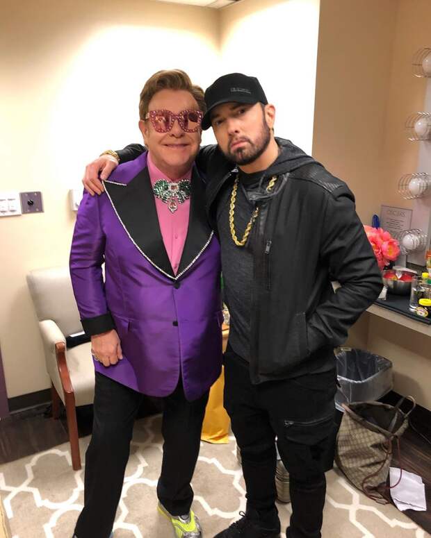Готовясь к триумфальному выступлению, Эминем встретился в гримерке с Элтоном Джоном. Рэпер поблагодарил "дядю Элтона" за визит.