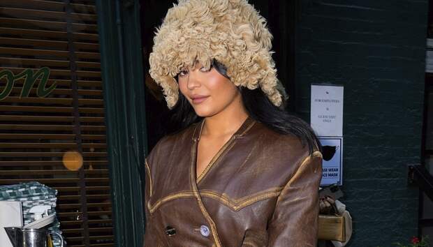 Слегка экстравагантный образ завершали меховые сапоги до колена с коричнево-белым коровьим принтом и «кудрявая» плюшевая шапка-ведро бежевого цвета. Не менее стильная трехлетняя Сторми была одета в мини-платье из денима и бело-серые кроссовки Nike Air Jordan – похоже, созданные в коллаборации с отцом Сторми рэпером Трэвисом Скоттом.