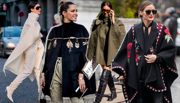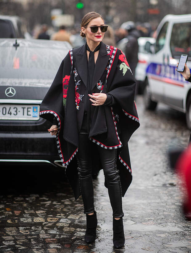 Высший пилотаж - монохромный образ в светло-бежевой гамме. Фасоны с декоративными этническими узорами тоже приветствуются - они привнесут в образ расслабленности. В доказательство универсальности кейпа внимательны изучайте нашу подборку с лучшими луками самых стильных гостей модных марафонов.