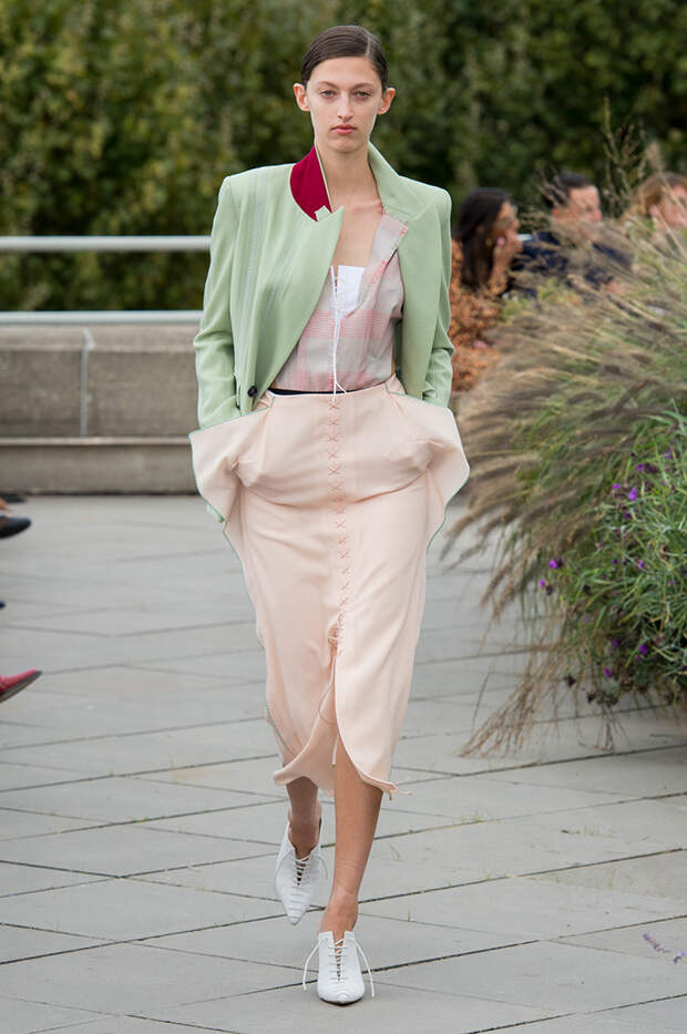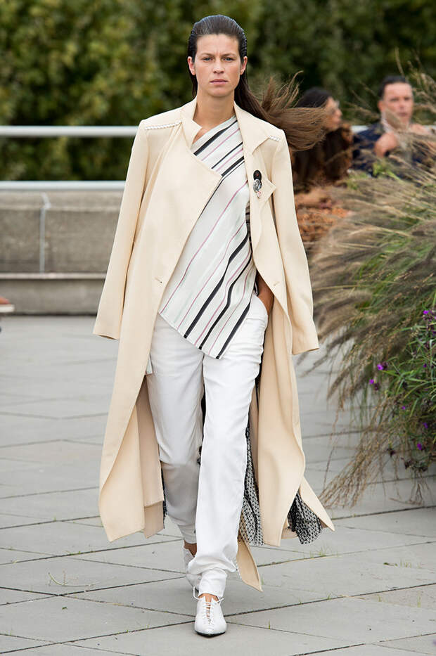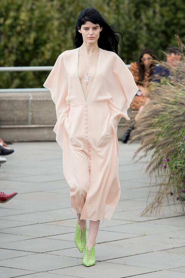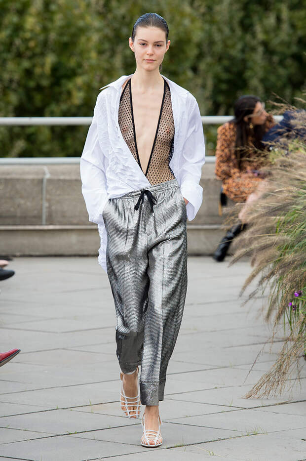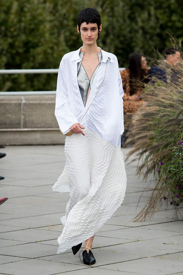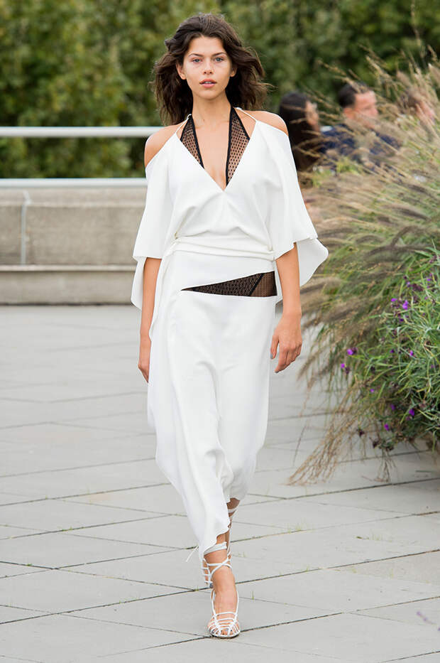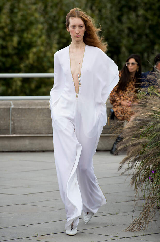 Следующей весной и летом можно ограничиться, по мнению Муре, тонкими натуральными материалами пастельных оттенков. Из них получились летящие платья с глубоким вырезом и разрезами на плечах, а также с ассиметричным подолом (что напоминает о нарядах нимф), костюмы прямого кроя и свободные юбки почти без деталей. Из прошлых коллекций дизайнер решил позаимствовать сеточку, из которой сделаны просвечивающие топы и боди. Муре, как и Джонатан Андерсон, и Виктория Бекхэм, сделал легкие расслабленные наряды, которые как бы говорят, что пора отдохнуть от излишества и эпох и наслаждаться тем, что можно носить одежду без оглядки на тенденции.