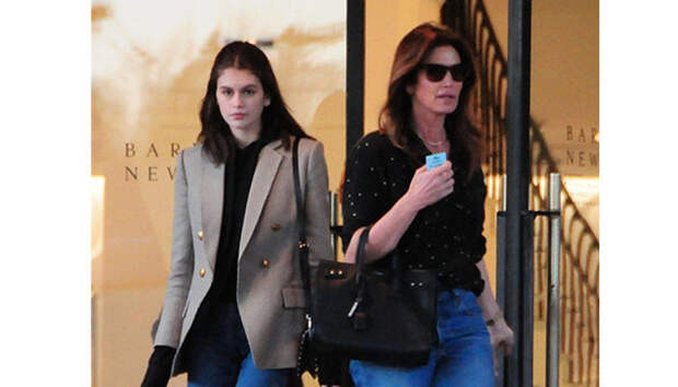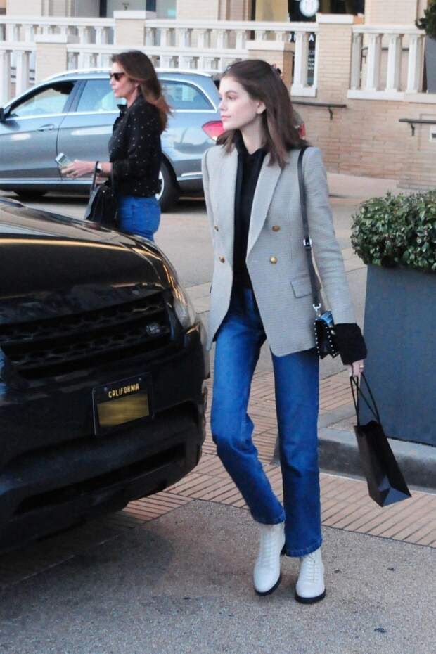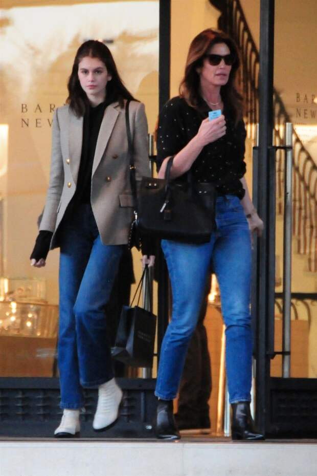 52-летняя супермодель Синди Кроуфорд воспитывает достойную замену - 19-летняя Кайя Гербер не уступает звездной матери в успешной модельной карьере. Кайя берет пример со своей ролевой модели и в выборе одежды - папарацци застали их во время совместного шопинга в Беверли-Хиллз в похожих образах. Синди надела черный топ и синие джинсы скинни, дополнив образ черными ботинками, а ее дочь надела пиджак поверх черного худи, отдав предпочтение белой обуви.