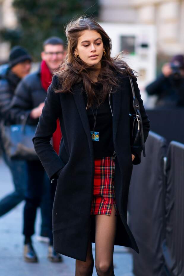 Кайя отправилась на шоу налегке: все ее вещи уместились в миниатюрную сумку Prada, а уже упомянутую юбку из красной шерсти в клетку наша героиня объединила вместе с трикотажным топом, приталенным пальто и грубыми ботинками на шнуровке.