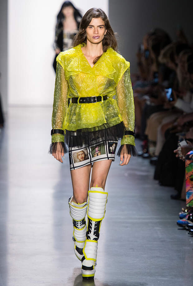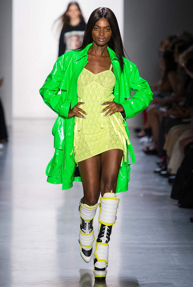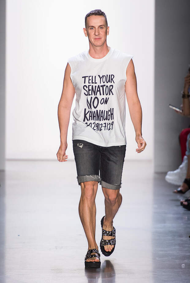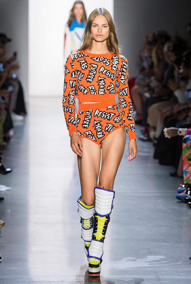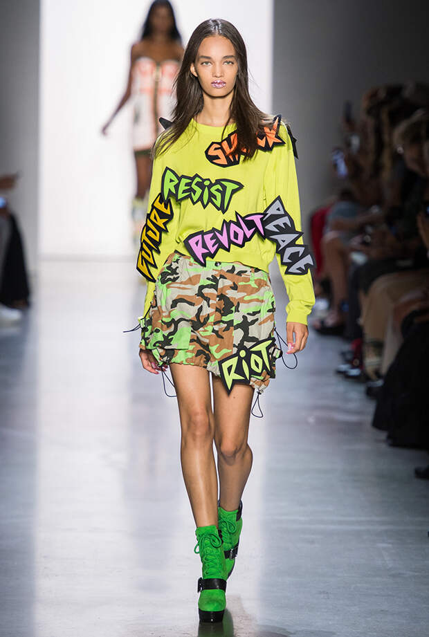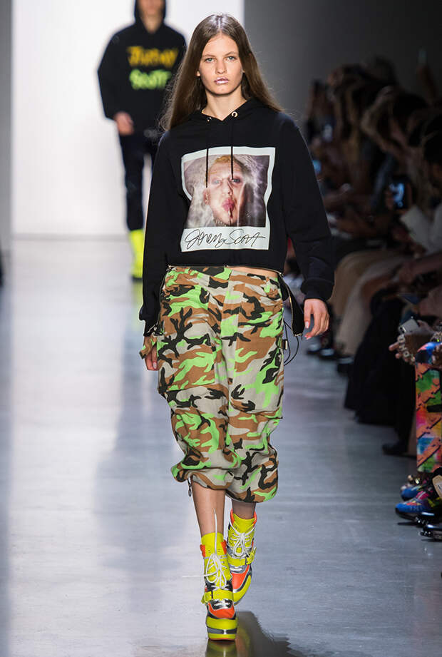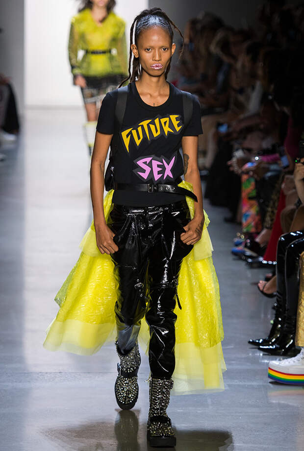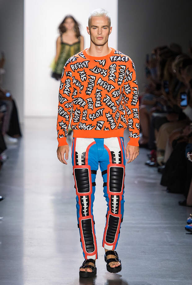 К ним Джереми вообще питает особую слабость: неон стал лейтмотивом коллекции. Свитшоты, комбинации, лифы, платья и топы кричащих цветов можно было увидеть на каждой второй модели, выходившей на подиум во время нью-йоркского шоу. Практически с той же частотой встречались вещи в стиле милитари, мотоциклетные костюмы, сапоги до плечей, брюки и юбки из кожи, денима и прозрачных тканей, а также свитеры с изображением Пикачу и наряды с фотопортретами Скотта.А в конце шоу сам “виновник торжества” гордо прошелся по подиуму в белой футболке с черной надписью Tell Your Senator No on Kavanaugh, в которой был скрыт протест против политики Дональда Трампа и его коллег и поддержка женщин и сексуальных меньшинств.