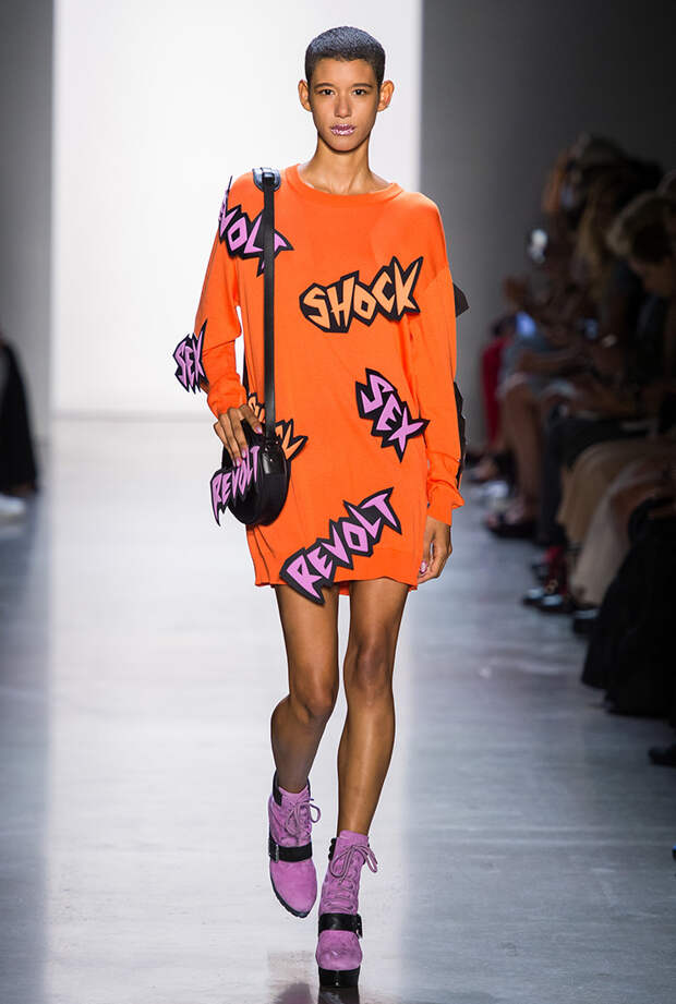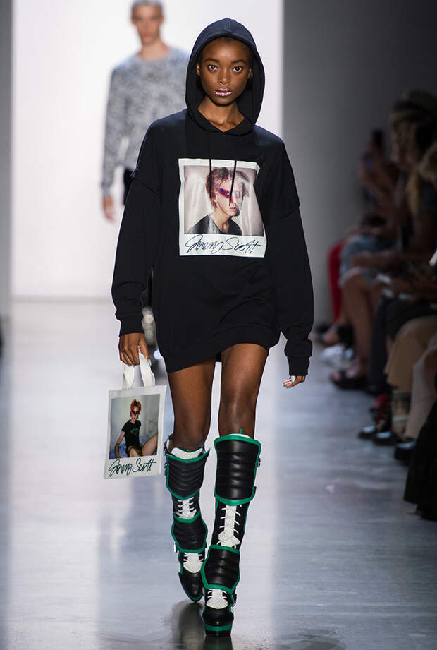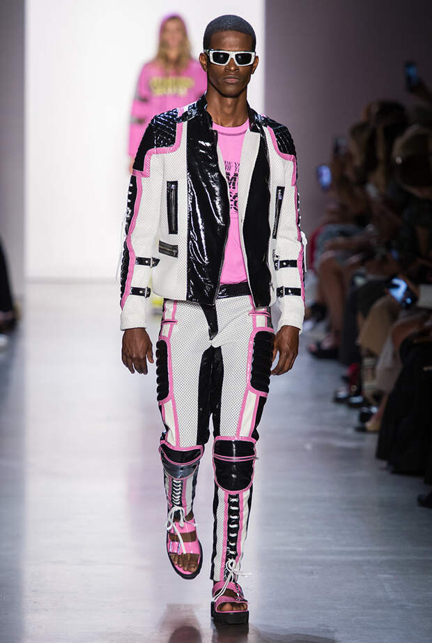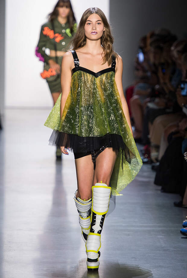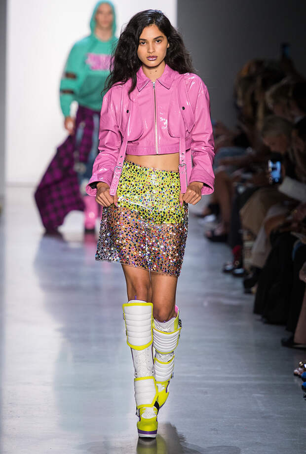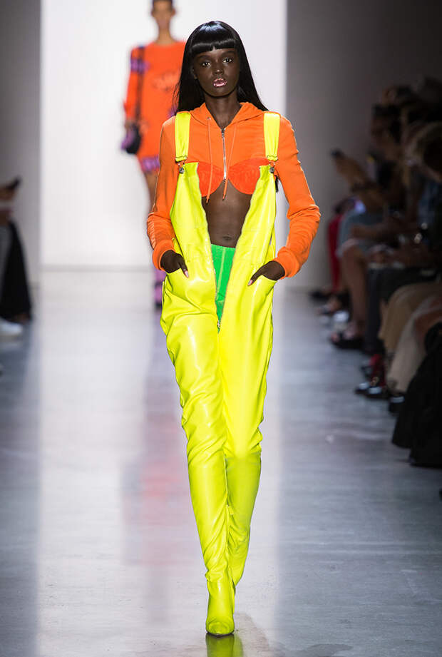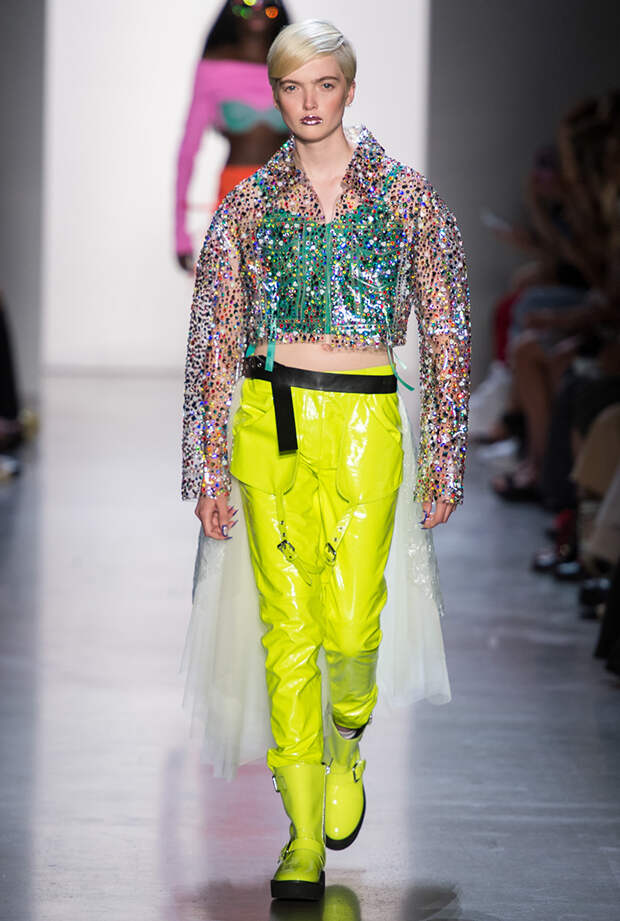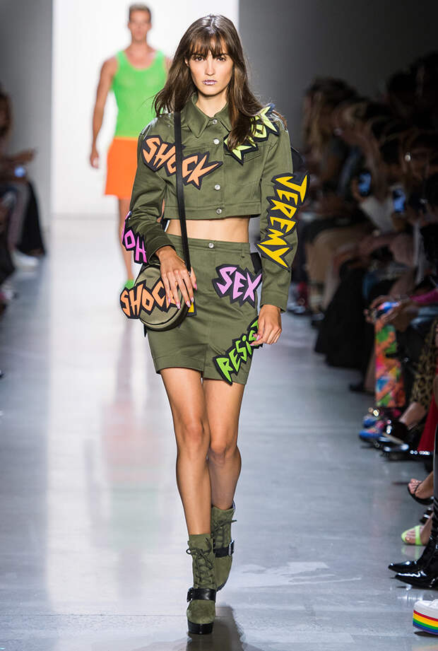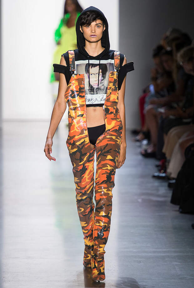 К ним Джереми вообще питает особую слабость: неон стал лейтмотивом коллекции. Свитшоты, комбинации, лифы, платья и топы кричащих цветов можно было увидеть на каждой второй модели, выходившей на подиум во время нью-йоркского шоу. Практически с той же частотой встречались вещи в стиле милитари, мотоциклетные костюмы, сапоги до плечей, брюки и юбки из кожи, денима и прозрачных тканей, а также свитеры с изображением Пикачу и наряды с фотопортретами Скотта.А в конце шоу сам “виновник торжества” гордо прошелся по подиуму в белой футболке с черной надписью Tell Your Senator No on Kavanaugh, в которой был скрыт протест против политики Дональда Трампа и его коллег и поддержка женщин и сексуальных меньшинств.