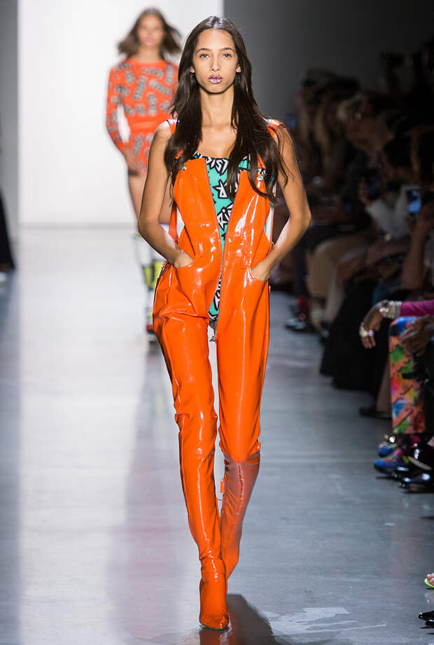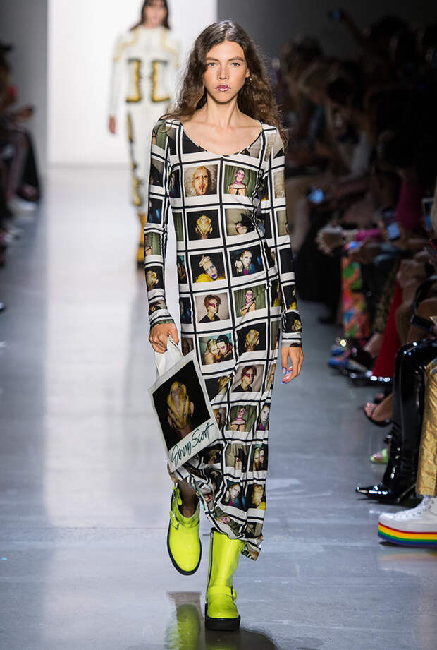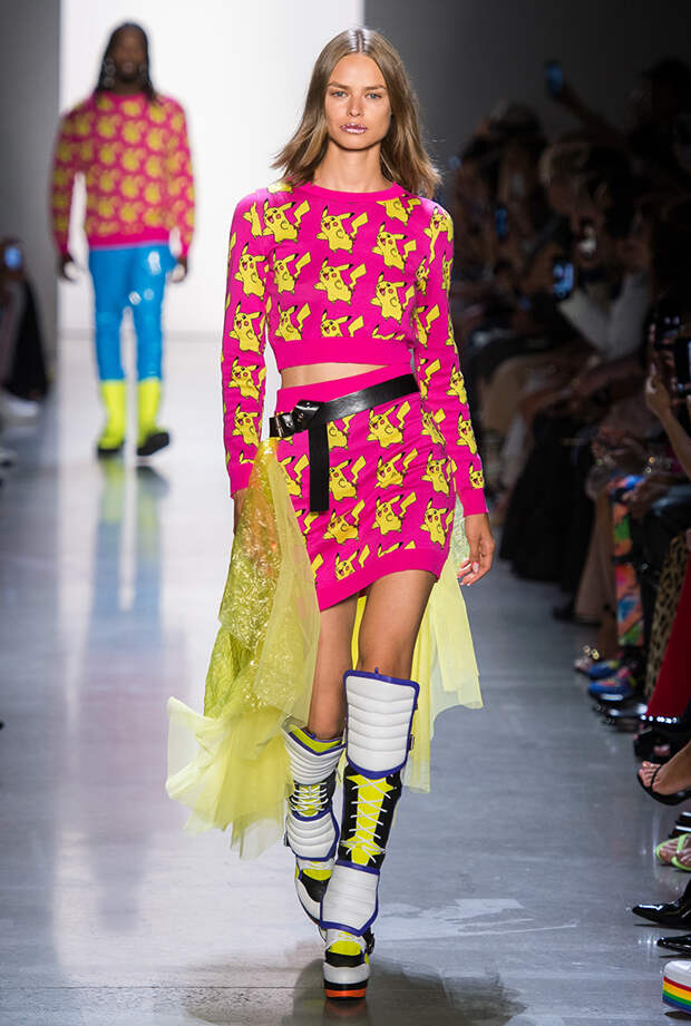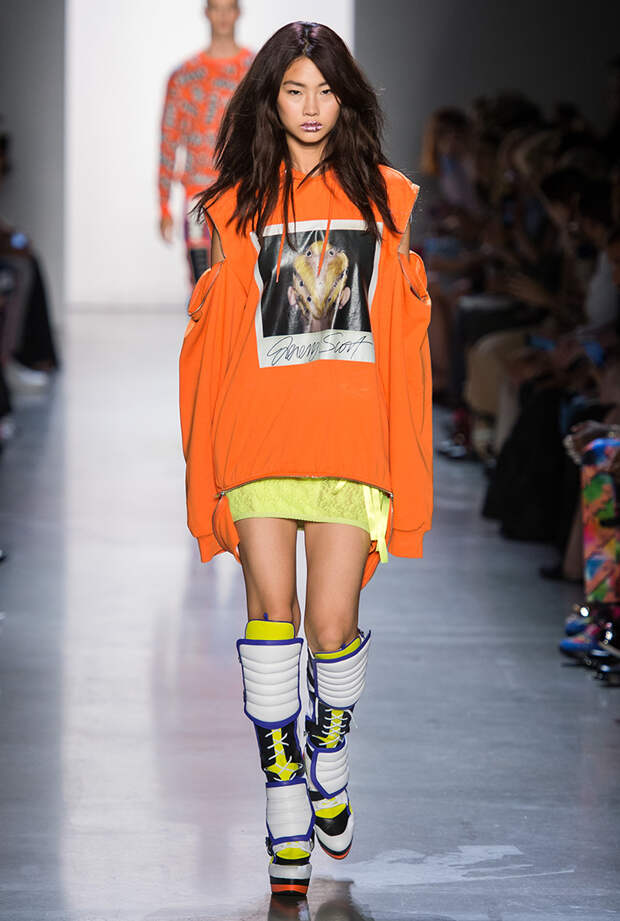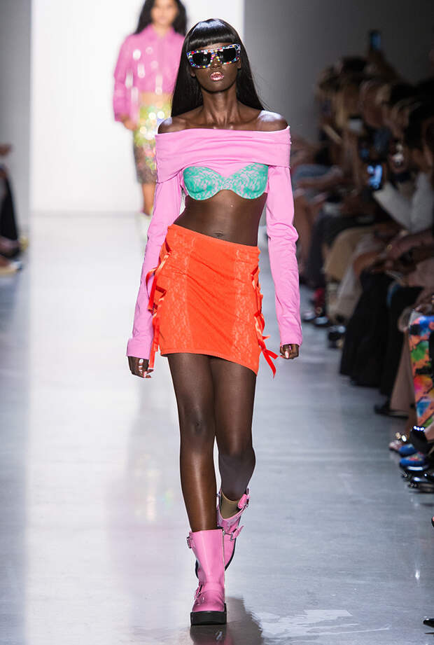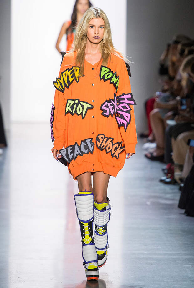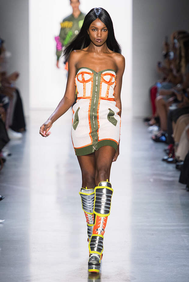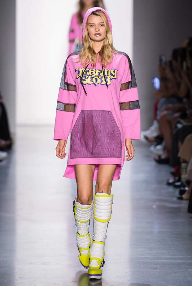 К ним Джереми вообще питает особую слабость: неон стал лейтмотивом коллекции. Свитшоты, комбинации, лифы, платья и топы кричащих цветов можно было увидеть на каждой второй модели, выходившей на подиум во время нью-йоркского шоу. Практически с той же частотой встречались вещи в стиле милитари, мотоциклетные костюмы, сапоги до плечей, брюки и юбки из кожи, денима и прозрачных тканей, а также свитеры с изображением Пикачу и наряды с фотопортретами Скотта.А в конце шоу сам “виновник торжества” гордо прошелся по подиуму в белой футболке с черной надписью Tell Your Senator No on Kavanaugh, в которой был скрыт протест против политики Дональда Трампа и его коллег и поддержка женщин и сексуальных меньшинств.