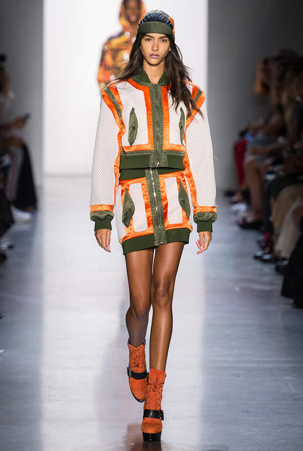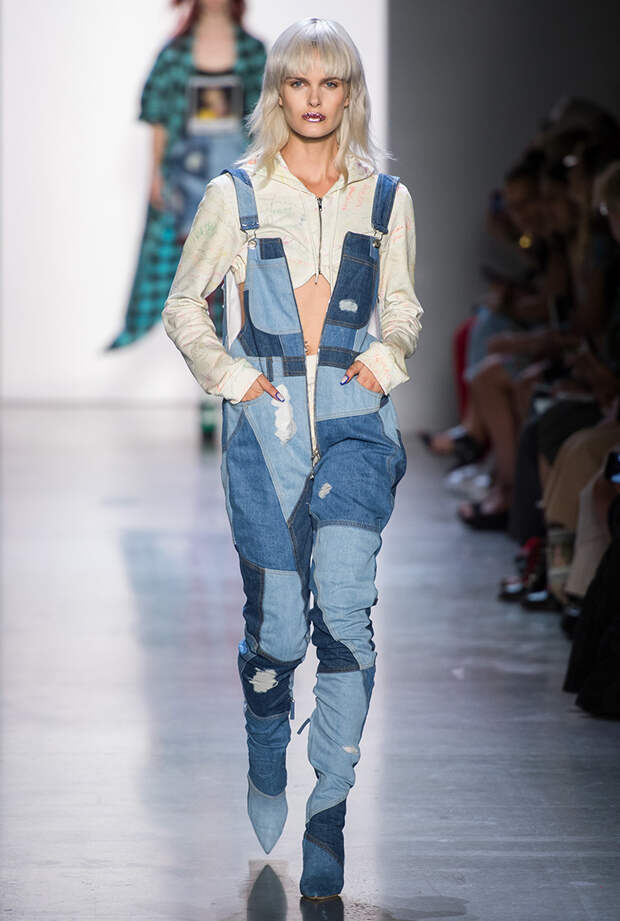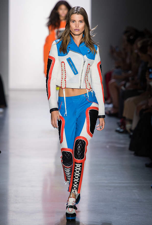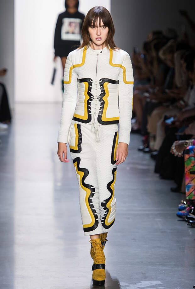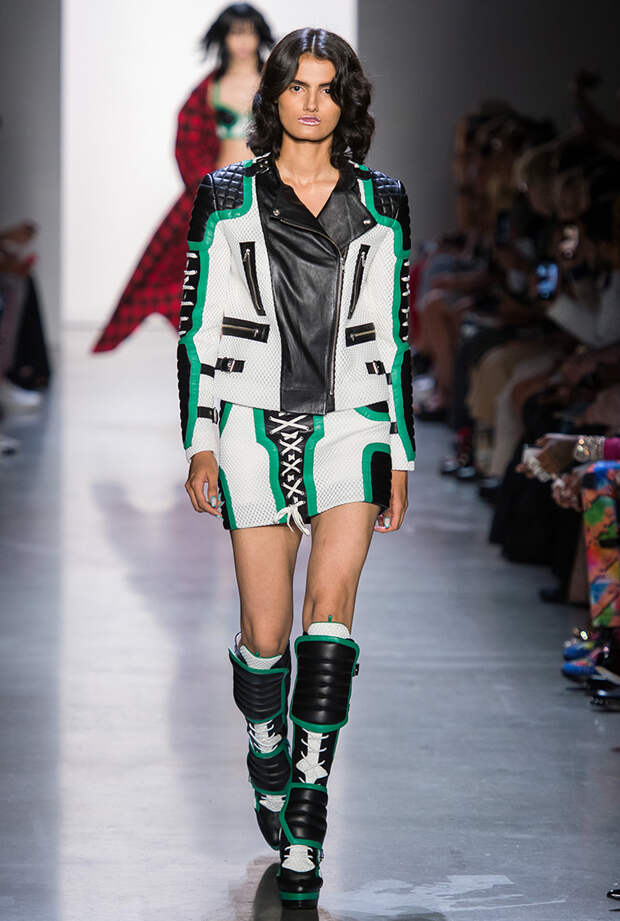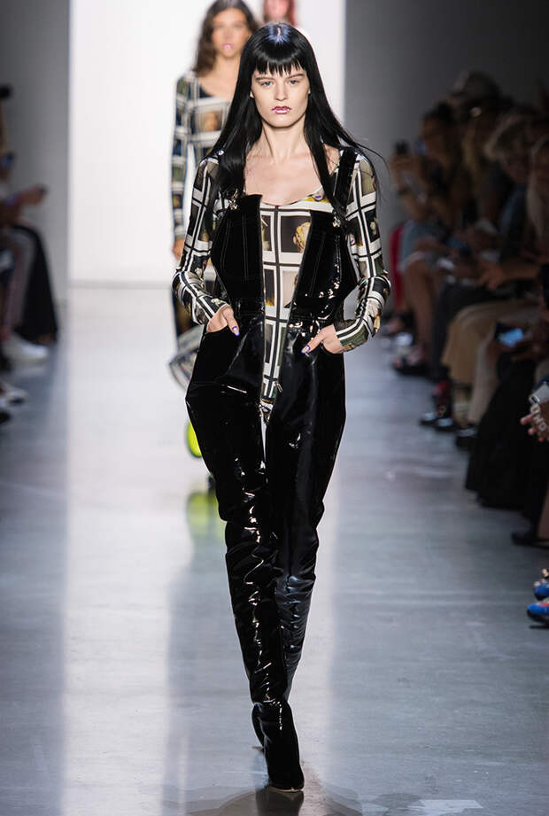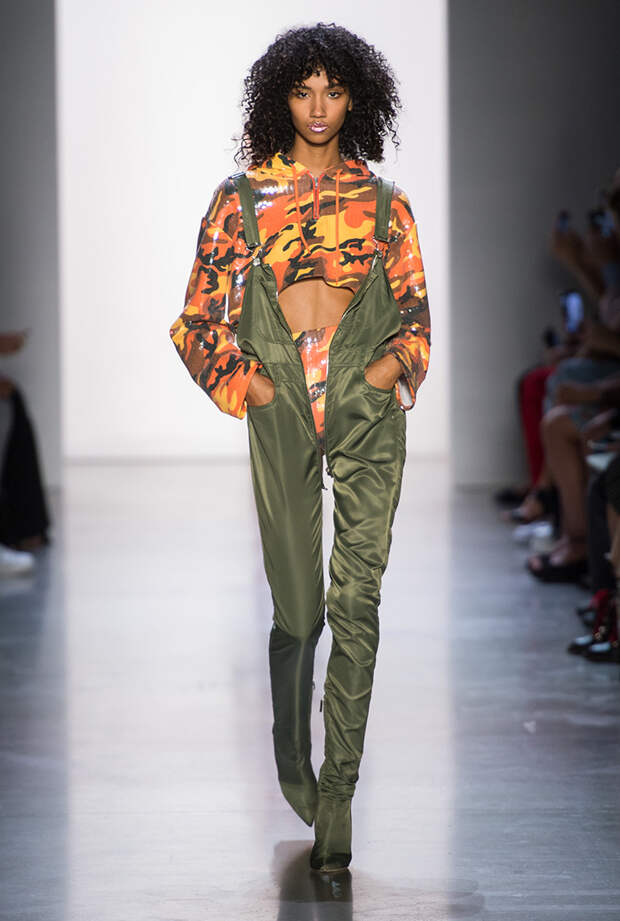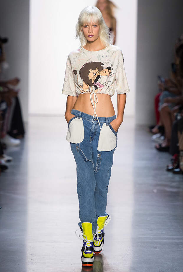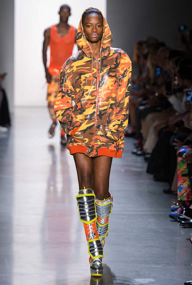 К ним Джереми вообще питает особую слабость: неон стал лейтмотивом коллекции. Свитшоты, комбинации, лифы, платья и топы кричащих цветов можно было увидеть на каждой второй модели, выходившей на подиум во время нью-йоркского шоу. Практически с той же частотой встречались вещи в стиле милитари, мотоциклетные костюмы, сапоги до плечей, брюки и юбки из кожи, денима и прозрачных тканей, а также свитеры с изображением Пикачу и наряды с фотопортретами Скотта.А в конце шоу сам “виновник торжества” гордо прошелся по подиуму в белой футболке с черной надписью Tell Your Senator No on Kavanaugh, в которой был скрыт протест против политики Дональда Трампа и его коллег и поддержка женщин и сексуальных меньшинств.