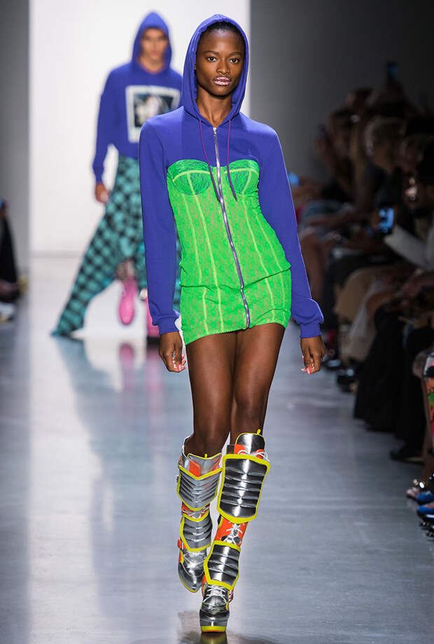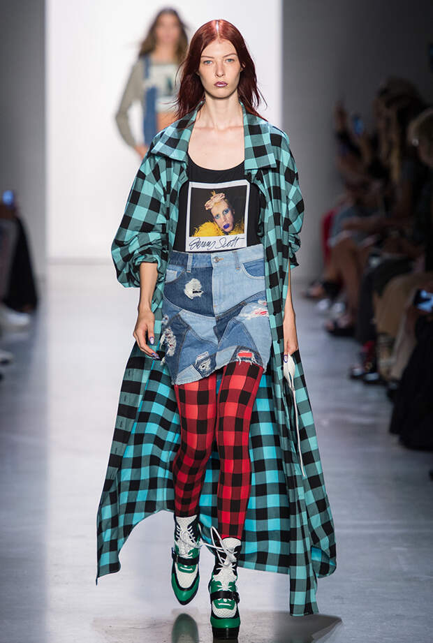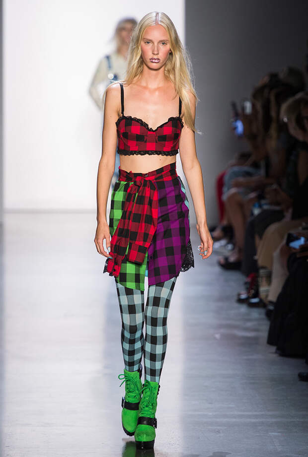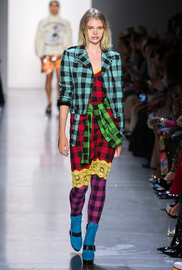 В новой коллекции Джереми Скотт переосмысливает главные тренды, полюбившиеся всем модницам этим летом и нашедшие отражение также в их осенних гардеробах. В первую очередь речь идет, конечно, о клетке: ее на весенне-летнем показе дизайнера было особенно много. Но не в классическом варианте (этого странно было бы ожидать от эпатажного модельера), а в ярких, порой даже кислотных оттенках.