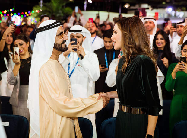 Но вот в отношении обуви не смогла удержаться от дизайнерских лодочек и выбрала пару с из кожи рептилии от Christian Dior в коричнево-сером оттенке. Интересным был и выбор аксессуаров: браслетам с драгоценными камнями Рания предпочла минималистичные Apple Watch демонстрируя, что восточные лидеры неравнодушны к западным т.