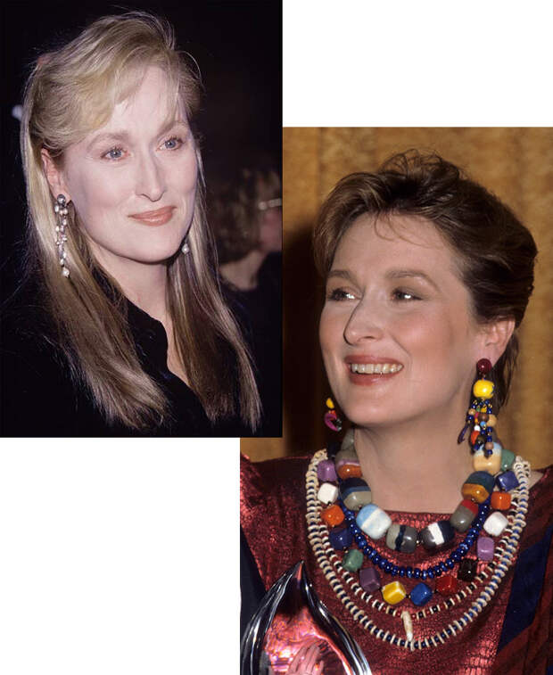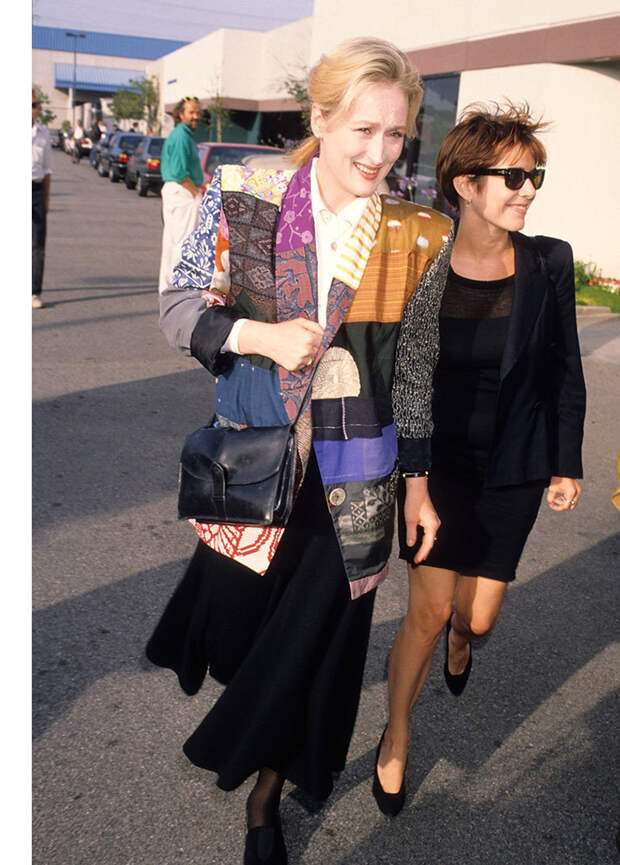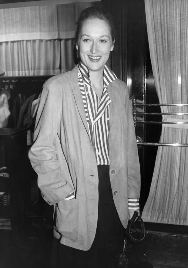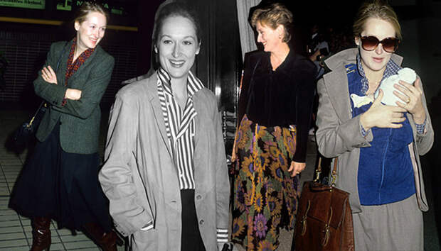 Звезда Мэрил Стрип взошла еще в 70-х: актриса дебютировала в театре, сыграла небольшую роль у Вуди Аллена в фильме "Манхэттен", а затем главную роль в оскароносной картине "Крамер против Крамера", за которую получила свою первую статуэтку. Кажется, стиль того времени надолго определил модные предпочтения Мэрил: оверсайз-костюмы, длинные бесформенные юбки, мужские жакеты, лыжные кофты, сумки-портфели и огромные очки — только несколько предметов, которые составляли ее гардероб на протяжении десятилетий.