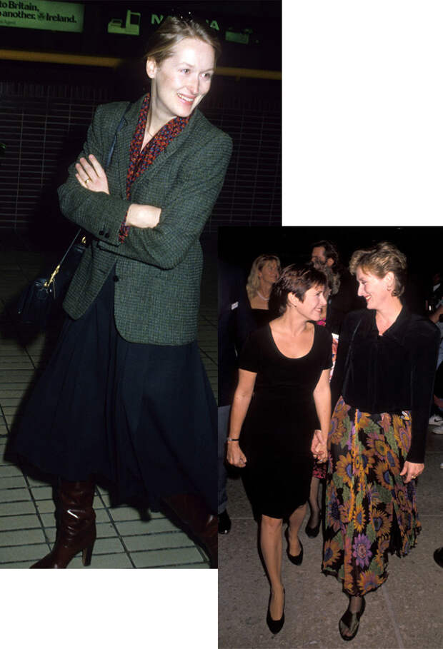 Заглянув в архивные фото, можно немало удивиться, насколько мода циклична. Юбки-карандаши, расклешенные длинные модели — все это было актуально еще 10, 20, 30 и больше лет назад. Юбка ниже колена всегда спасет положение, если не найдется подходящего платья: по примеру Мэрил к ней можно добавить свободную блузку и приталенный жакет.