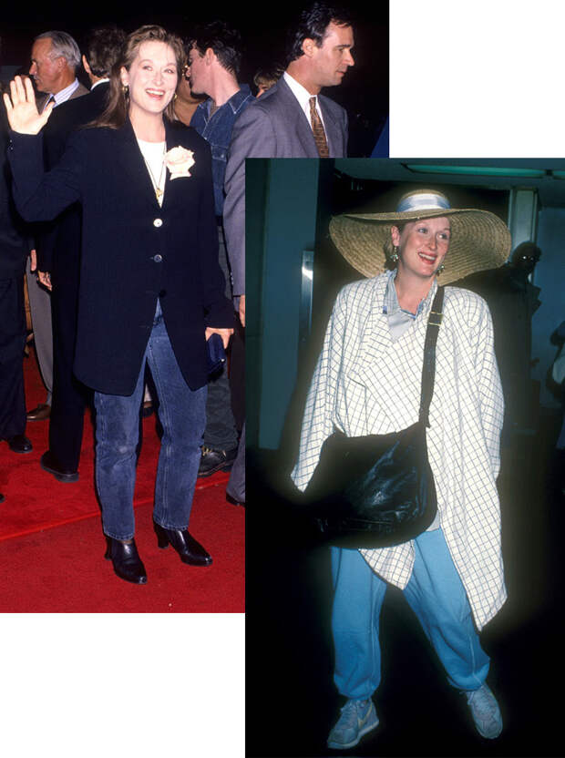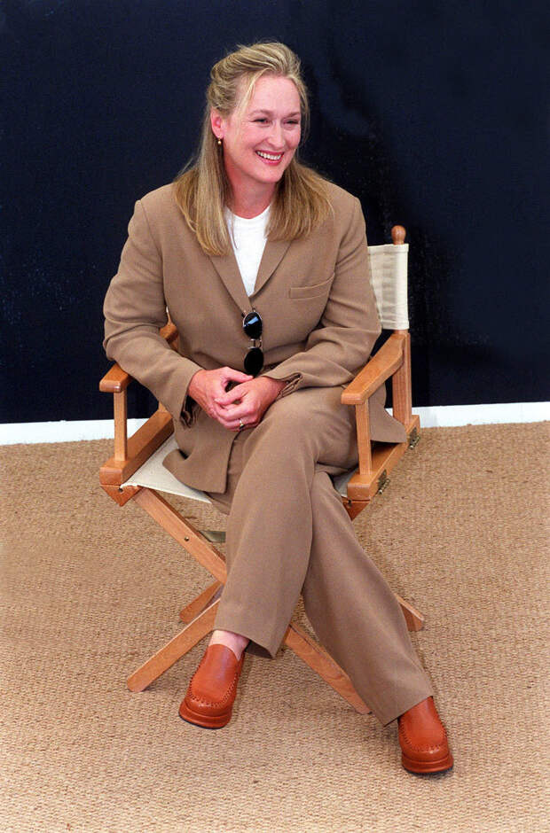 В брюках и жакетах одного цвета можно ходить и в повседневной жизни (вне работы) и не выглядеть при этом строго. Мэрил выбирала легкие костюмы для самолета, а более плотные — для различных встреч. Под жакет достаточно надеть футболку, и образ уже станет неформальным.