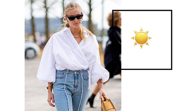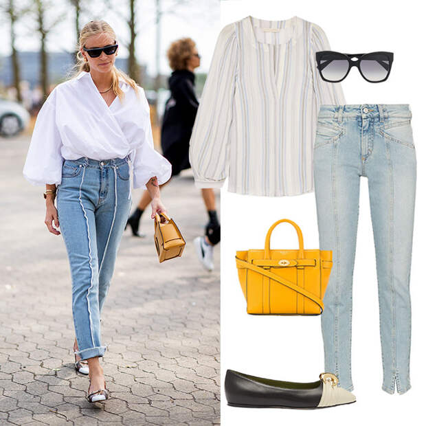 Блузка VANESSA BRUNO, 7 327 руб.; джинсы GIVENCHY, 55 170 руб.; очки MAX MARA, 14 879 руб.; сумка MULBERRY, 51 794 руб.; балетки GUCCI, 44 532 руб.