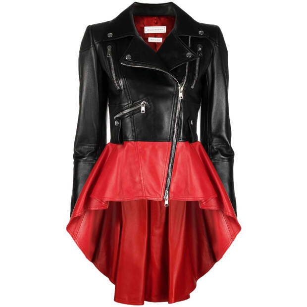 Еще один рискованный тренд — контраст цветов и форм. Можно выбрать более скромный вариант, как у Golden Goose Deluxe Brand, с сочетанием классической формы и дерзкого белого принта. А можно отдать предпочтение необычному подходу Alexander McQueen. В весенне-летней коллекции бренда были представлены косухи с ассиметричными басками контрастных оттенков.