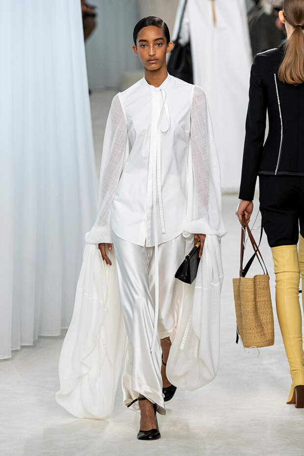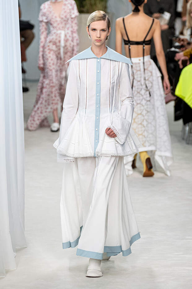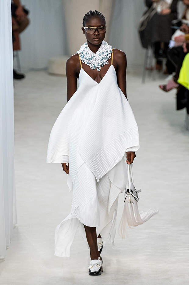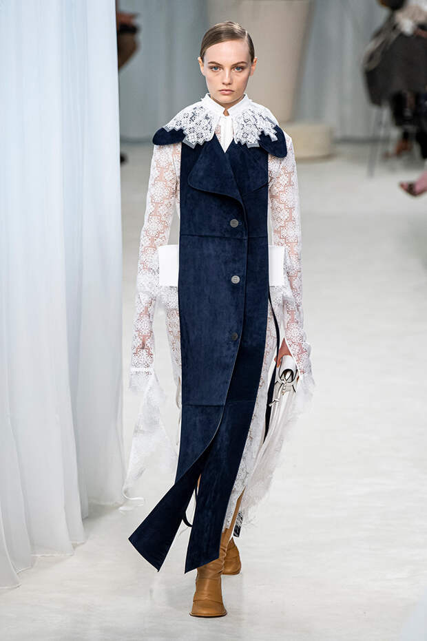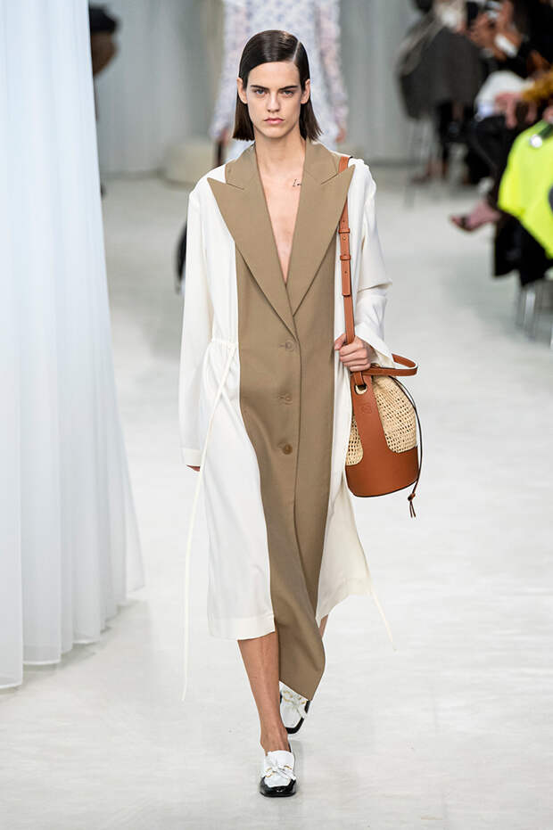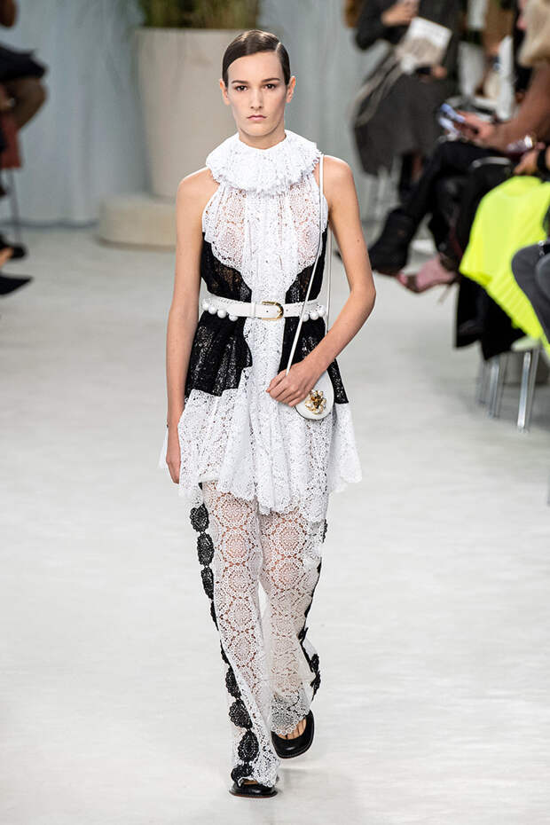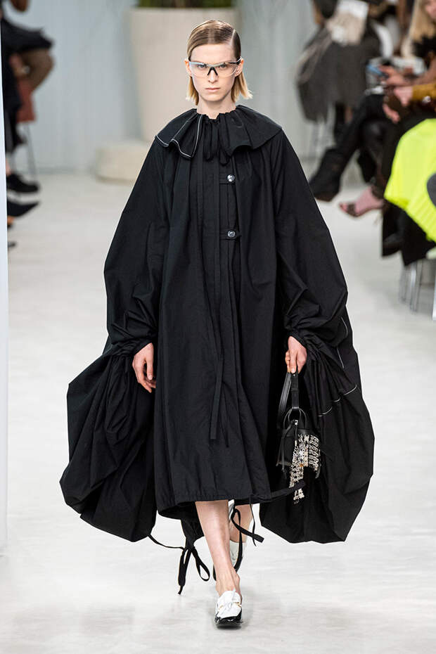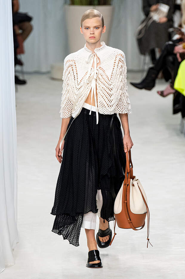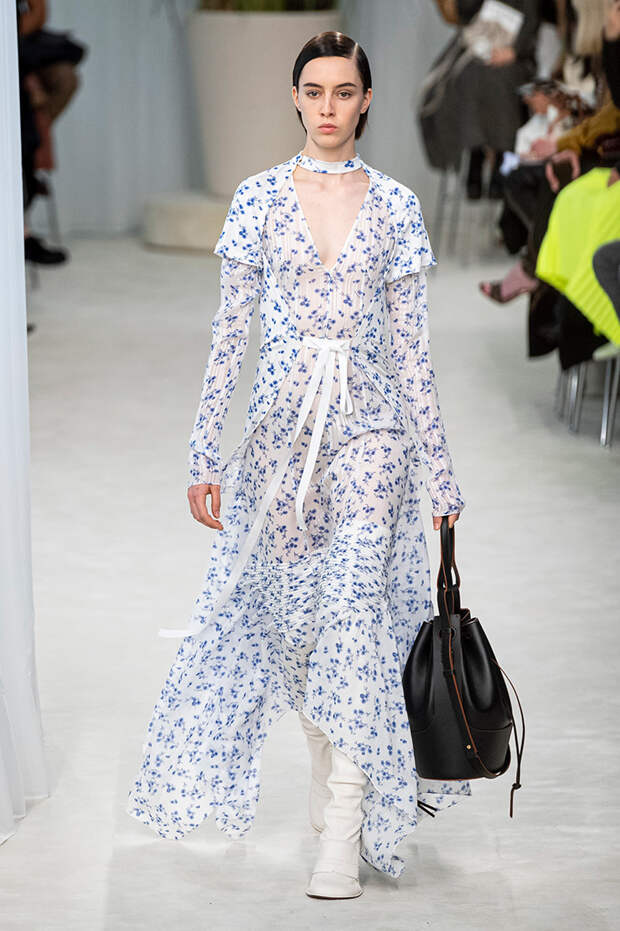 А к последнему платью, свадебному, и вовсе пришивает крохотные тканевые розочки, чудовищно старомодные и столь же милые. Все это придает коллекции, полной вещей довольно роскошных, очень трогательный, наивный подтон. Хотя в полупрозрачных костюмах с пышными манжетами и воротниками, напоминающими клоунские, хрупкости и своей очень особенной красоты хватает и так.Состоялась на подиуме и важная премьера: публике представили новую сумку Loewe, Balloon bag. На воздушный шарик она на самом деле не то чтобы похожа — объединяет их разве что некоторая округлость форм.