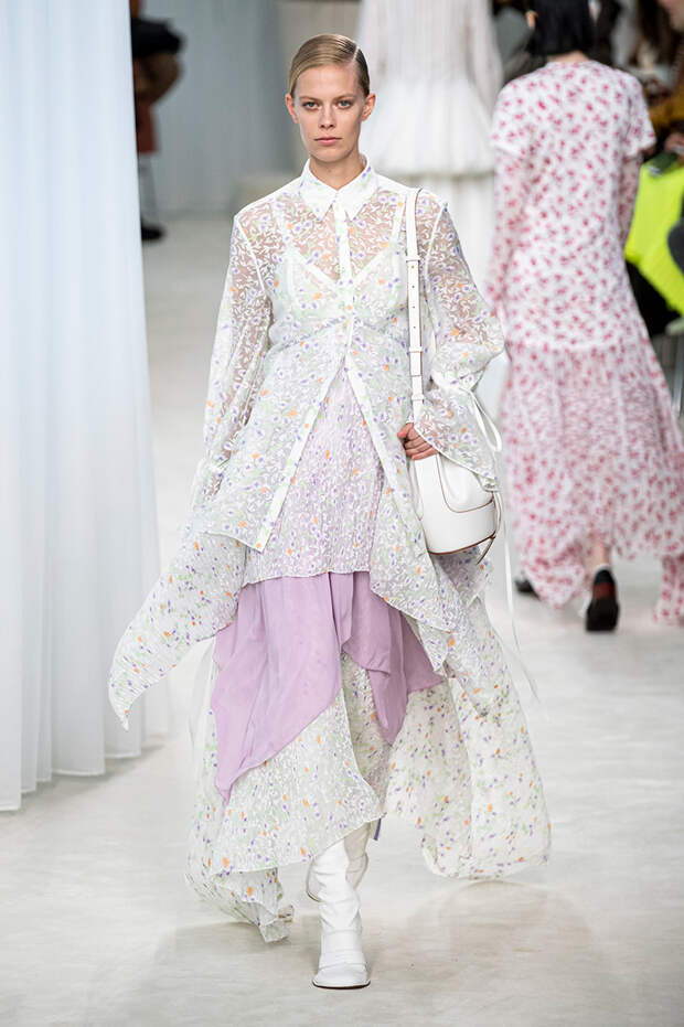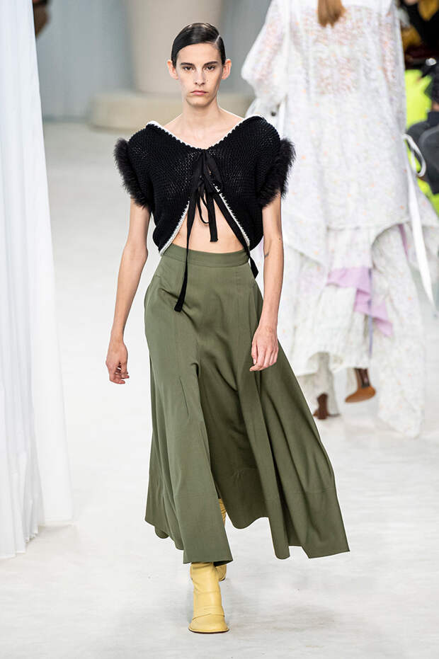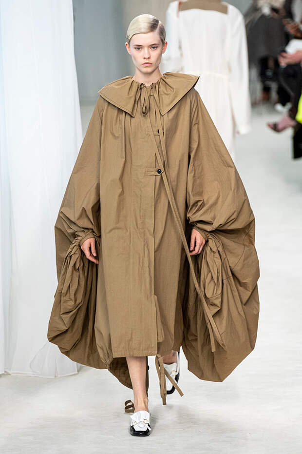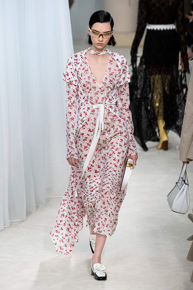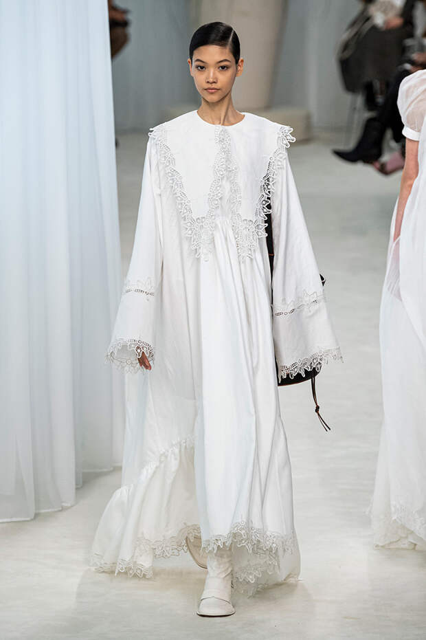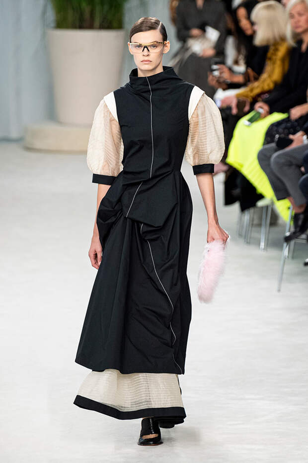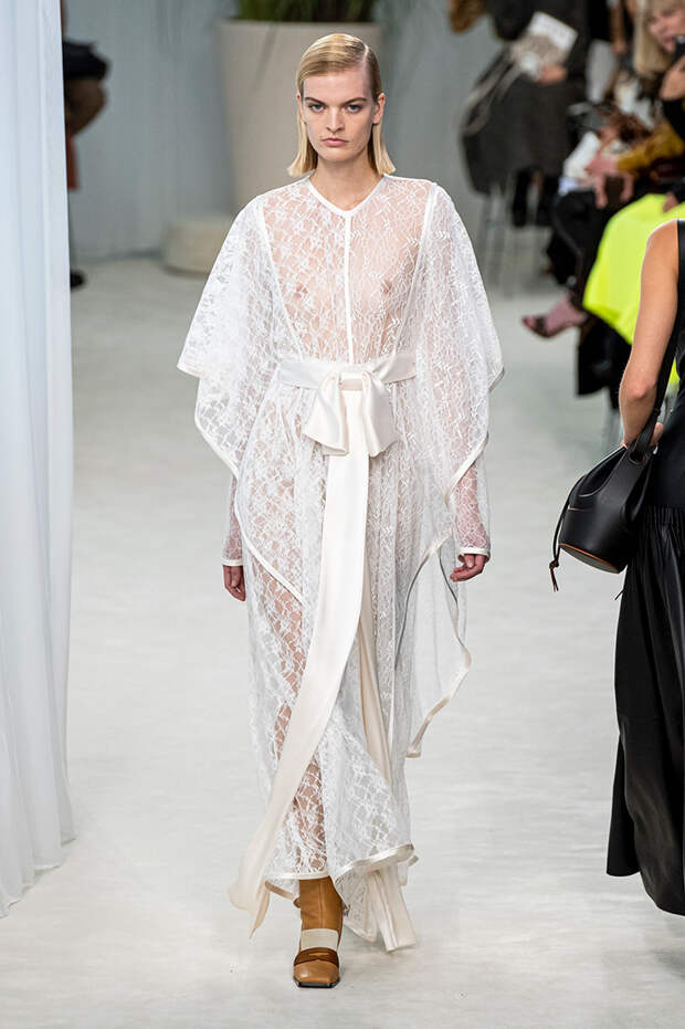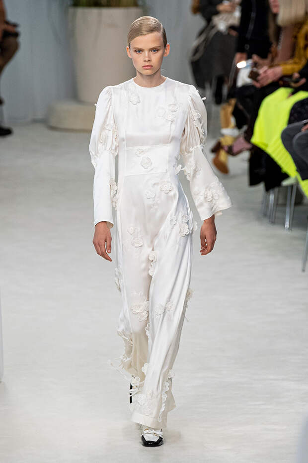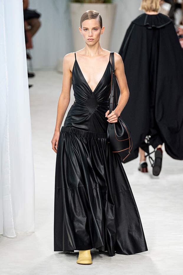 А к последнему платью, свадебному, и вовсе пришивает крохотные тканевые розочки, чудовищно старомодные и столь же милые. Все это придает коллекции, полной вещей довольно роскошных, очень трогательный, наивный подтон. Хотя в полупрозрачных костюмах с пышными манжетами и воротниками, напоминающими клоунские, хрупкости и своей очень особенной красоты хватает и так.Состоялась на подиуме и важная премьера: публике представили новую сумку Loewe, Balloon bag. На воздушный шарик она на самом деле не то чтобы похожа — объединяет их разве что некоторая округлость форм.
