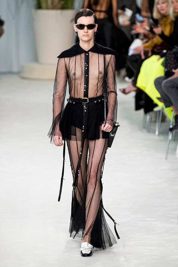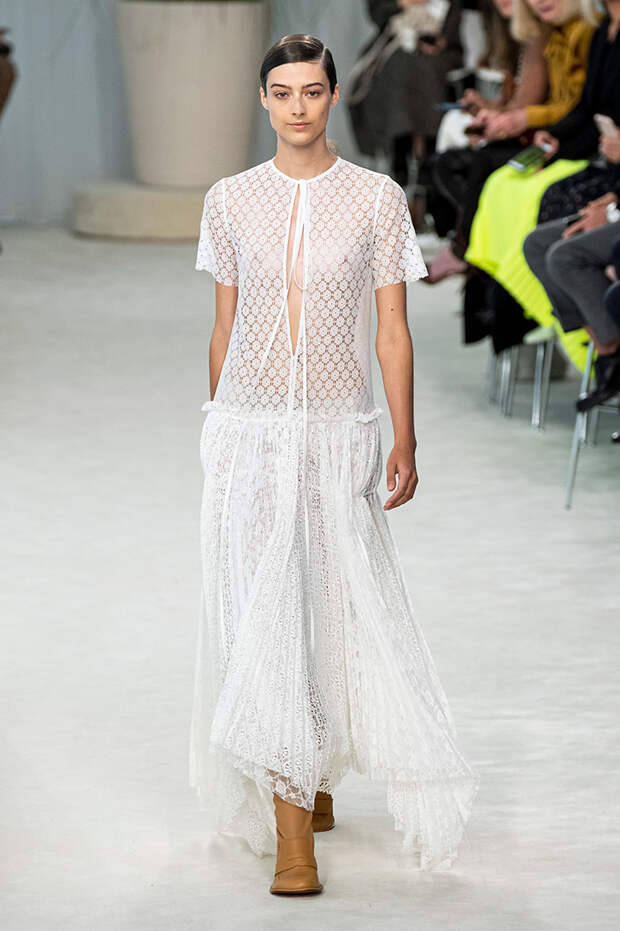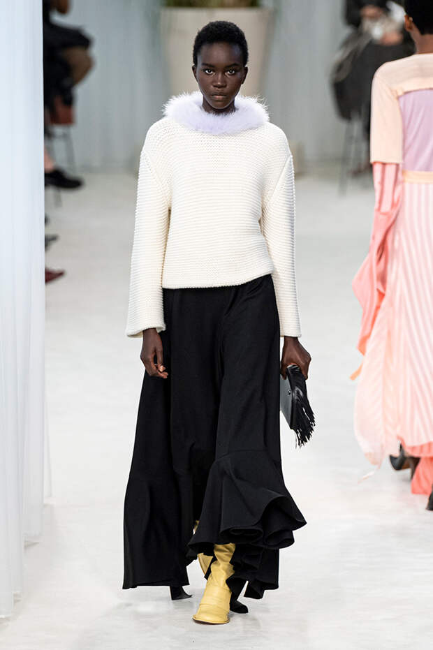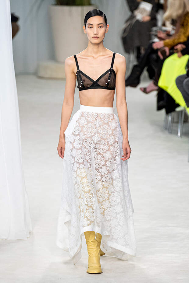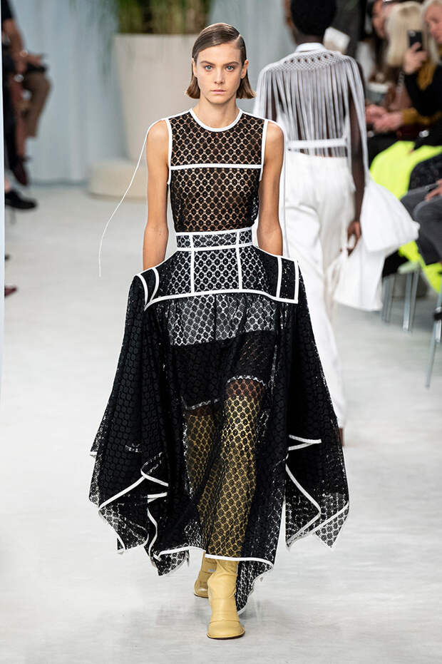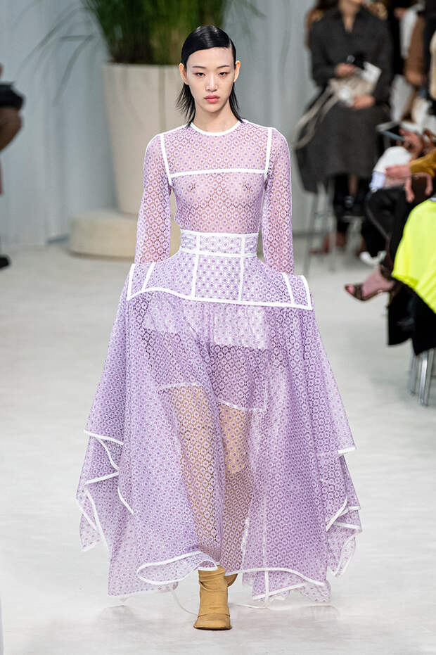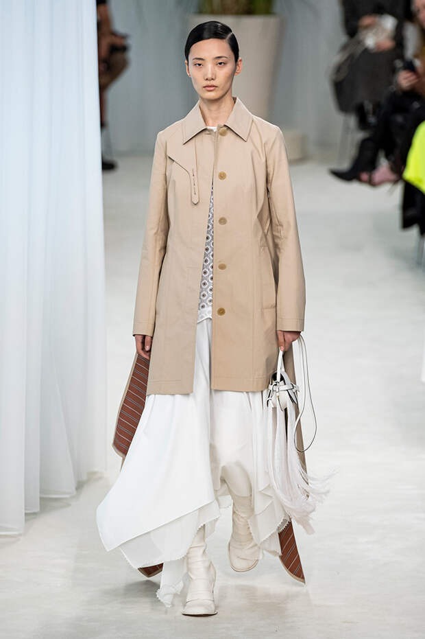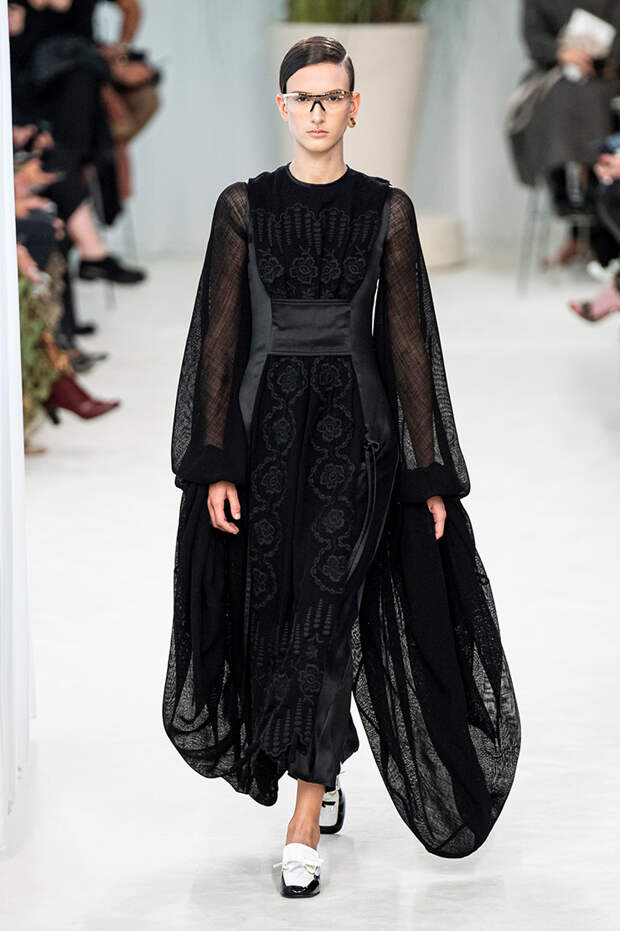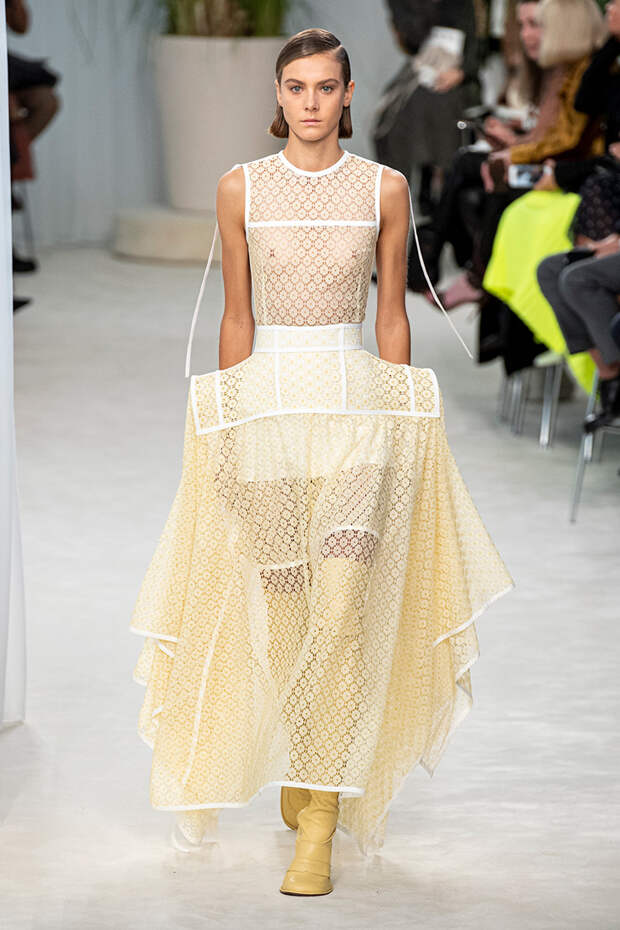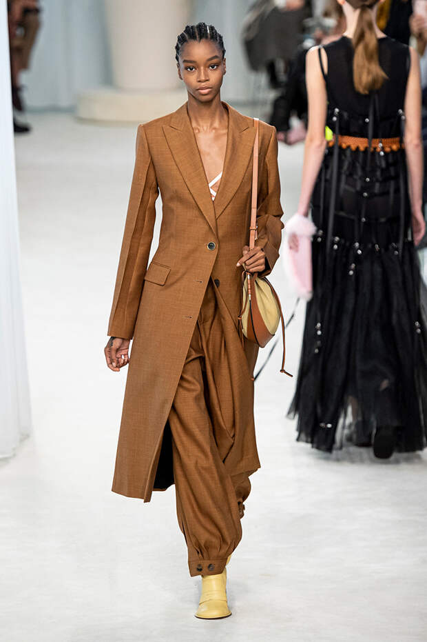 А к последнему платью, свадебному, и вовсе пришивает крохотные тканевые розочки, чудовищно старомодные и столь же милые. Все это придает коллекции, полной вещей довольно роскошных, очень трогательный, наивный подтон. Хотя в полупрозрачных костюмах с пышными манжетами и воротниками, напоминающими клоунские, хрупкости и своей очень особенной красоты хватает и так.Состоялась на подиуме и важная премьера: публике представили новую сумку Loewe, Balloon bag. На воздушный шарик она на самом деле не то чтобы похожа — объединяет их разве что некоторая округлость форм.