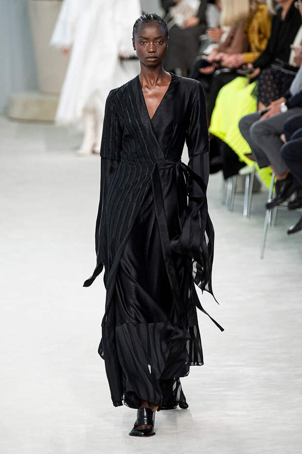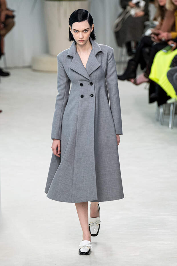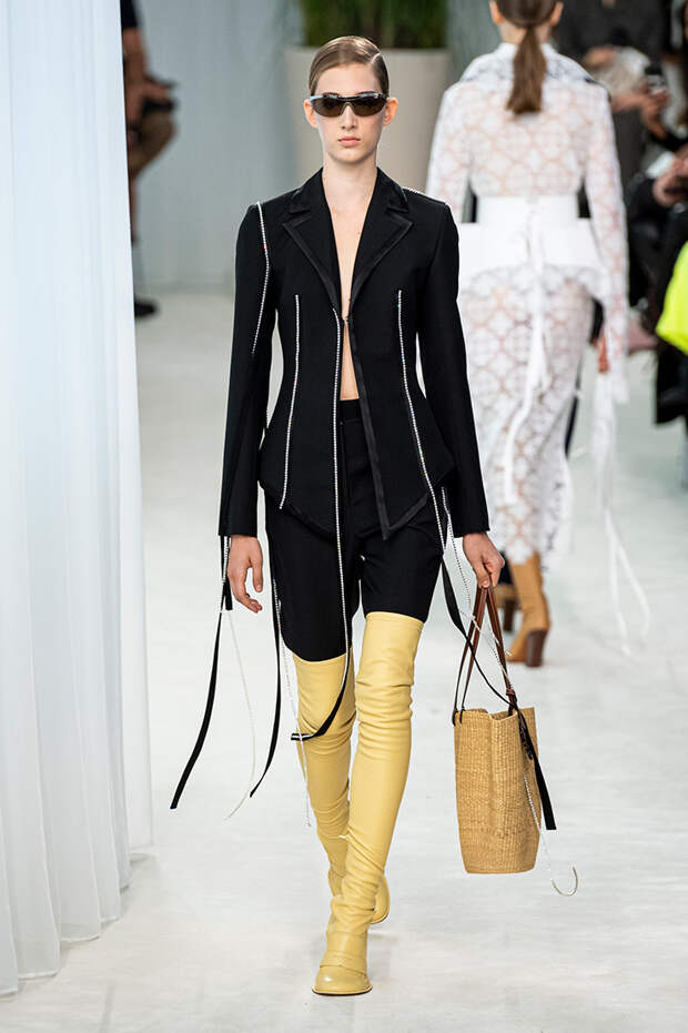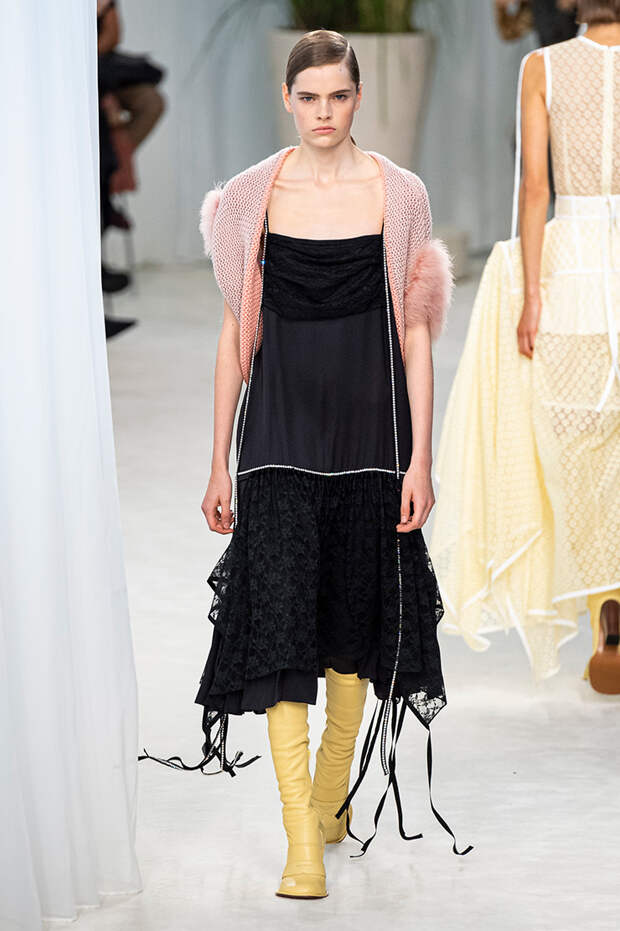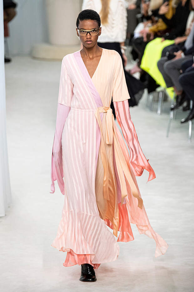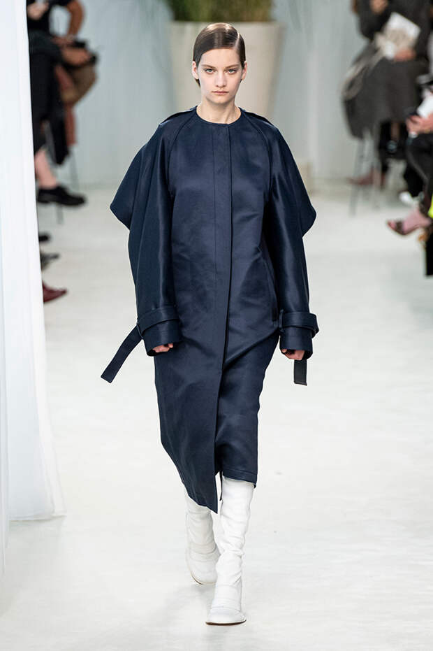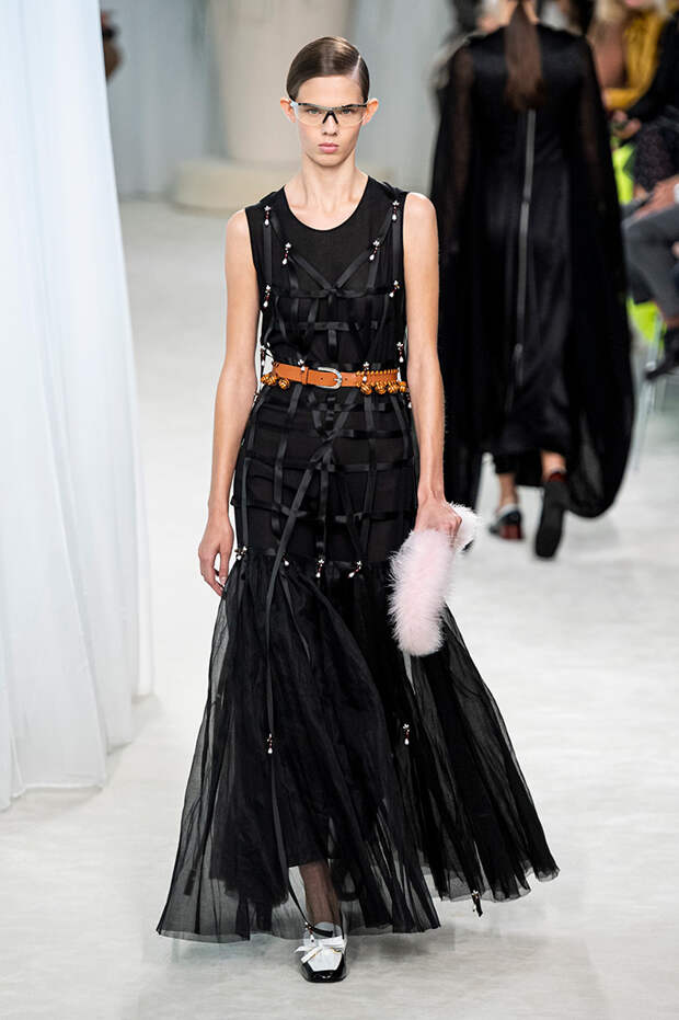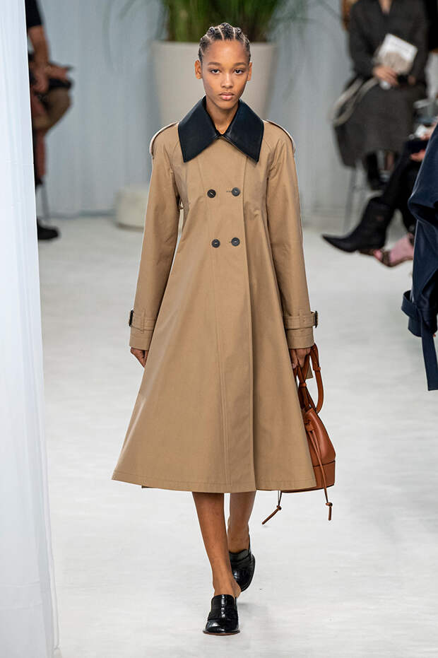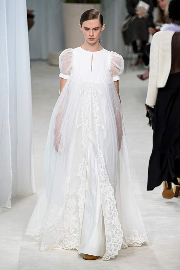 А к последнему платью, свадебному, и вовсе пришивает крохотные тканевые розочки, чудовищно старомодные и столь же милые. Все это придает коллекции, полной вещей довольно роскошных, очень трогательный, наивный подтон. Хотя в полупрозрачных костюмах с пышными манжетами и воротниками, напоминающими клоунские, хрупкости и своей очень особенной красоты хватает и так.Состоялась на подиуме и важная премьера: публике представили новую сумку Loewe, Balloon bag. На воздушный шарик она на самом деле не то чтобы похожа — объединяет их разве что некоторая округлость форм.