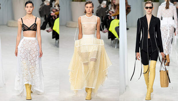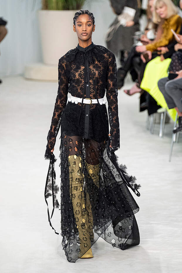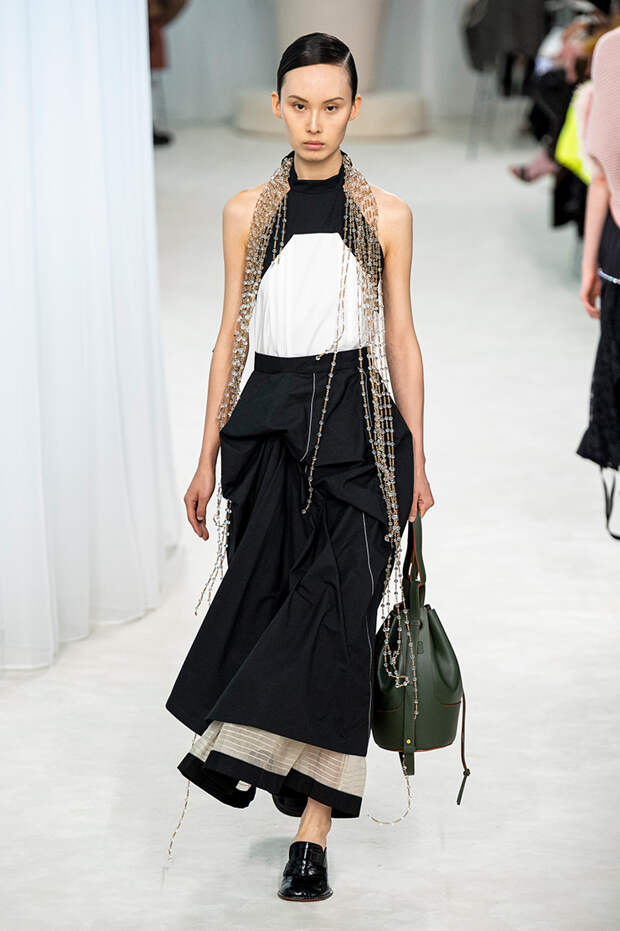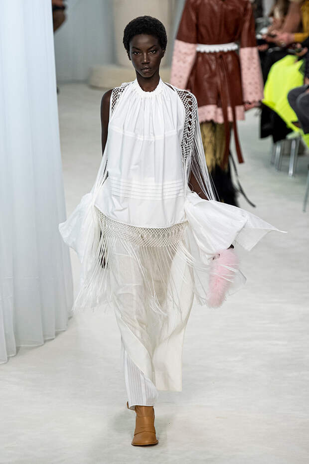 Новая коллекция Джонатана Андерсона для Loewe — нежная ода ручному труду. Из ажурных кружев дизайнер собирает целые костюмы, воротники расшивает длинными нитями стеклянных бус, к поясам крепит жемчужины, а на самых разных вещах тут и там оставляет маленькие сувениры — бисерные плетеные штучки, которым определение так с ходу и не подберешь.