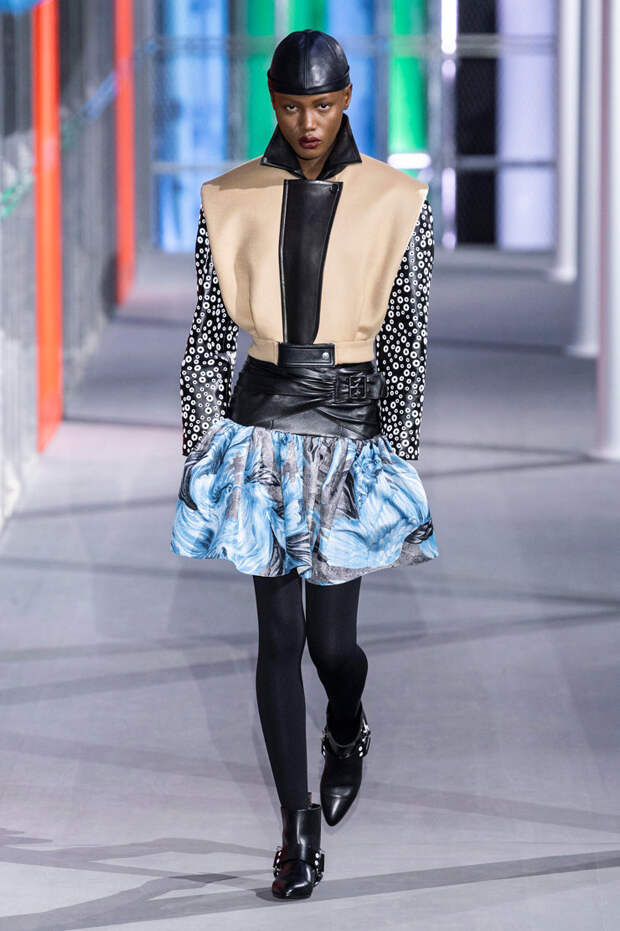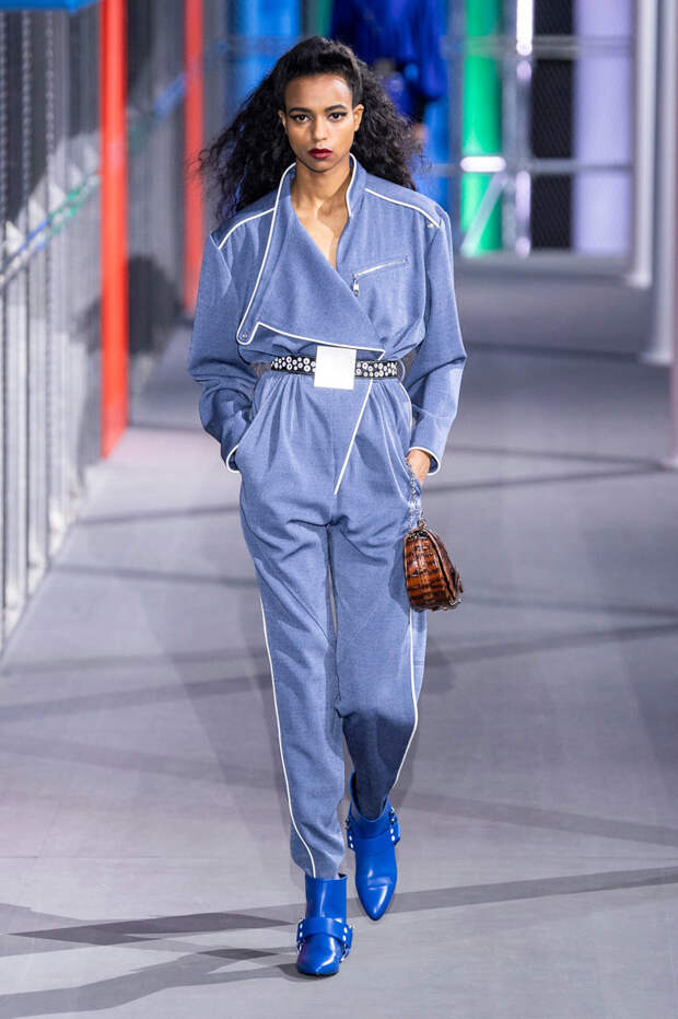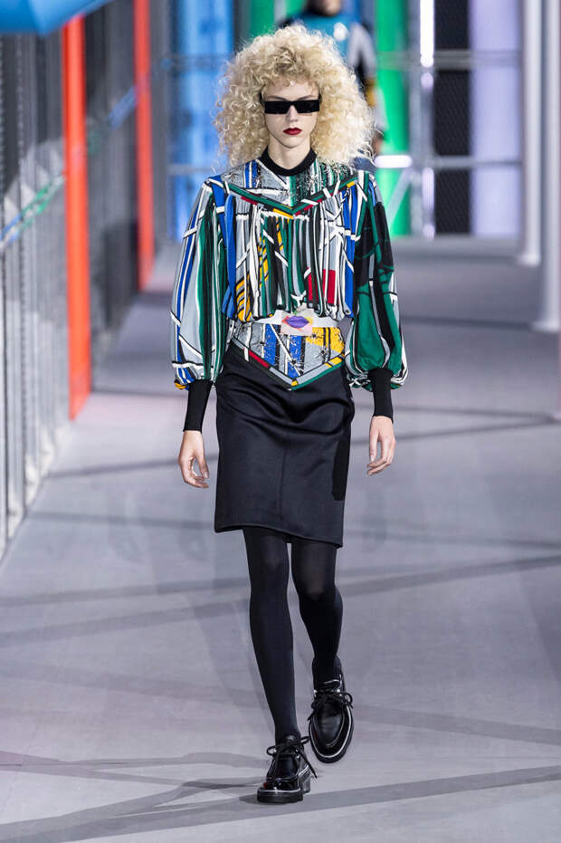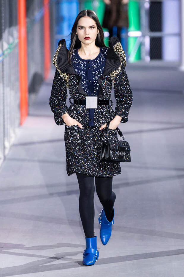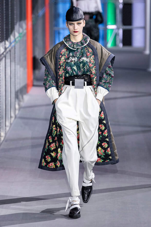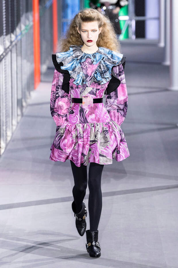 Готов к неоднозначной реакции был и сам дизайнер — Центр Помпиду, как он отметил, тоже сначала критиковали, "но он стал центром Парижа. Для культуры, для молодых людей, для всех, кто смотрит в будущее. Глаз привыкает со временем, вкусы развиваются и меняются". Именно Помпиду и вдохновил Жескьера на создание этой коллекции — точнее, не сам арт-центр, а площадь перед ним, где всегда кипит движение. "Я люблю сидеть там и наблюдать за людьми. Там видишь, каков Париж на самом деле. Видишь уличных танцоров, посетителей музеев, которые бывают эксцентричными, людей из мира моды, готов — всех", — рассказывал он.Все они, пестрая толпа, которая представляет собой Париж в миниатюре, и должны были стать героями коллекции. Именно поэтому осенний сезон стал коктейлем из всего, что только можно представить. Но все-таки, глядя на подиум, невольно начинаешь думать, что следил Николя Жескьер за парижанами не вчера, не в прошлом году и даже не в нашем на самом-то деле веке, а где-то в 80-х. От ощущения, что все это время смотришь ностальгическую фантастику, как и в нескольких прошлых сезонах, сложно избавиться: в кадре mom's jeans и брюки-бананы той же посадки, плечи, яркие краски... Школьные куртки, как у Марти Макфлая, жакеты с пышными рукавами и прямые юбки, как у героинь Молли Рингуольд, платья с корсетами, как у звезд Dance TV, серебряные доспехи и все те же чудные шапочки, как у космических пришельцев в старом наивном сай-фае — практически все о чем-то напоминает.