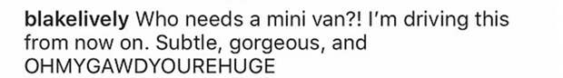 Часто такие сообщения носят юмористический характер: знаменитости обожают подшучивать друг над другом. Обычно их семейные шутки становятся достоянием общественности и расходятся по соцсетям в качестве мемов. Наверняка такая судьба ждет и новый язвительный комментарий, написанный Блейк мужу в годовщину их свадьбы.9 сентября, в день 6-летия их с Лайвли брака, Рейнольдс опубликовал снимок грузовика со своим фото на кузове (дело в том, что актер является лицом популярной в США марки джина). Этот кадр он подписал так: “Оказывается, у водителя действительно нет наличных. Зато у него есть перцовый баллончик… и много хорошего джина”. Супруга звезды “Дэдпула” не упустила возможности подшутить над благоверным. Вместо того чтобы строчить любимому трогательные поздравления, Блейк решила пойти иным путем и написала такой комментарий: “Кому нужен мини-фургон?! С настоящего момента я вожу этот автомобиль. Утонченный, шикарный... и, боже, просто ОГРОМНЫЙ!”. Несложно понять, что звезда сериала "Сплетница" явно намекает на нескромность своего любимого и подшучивает над его стремлением в лишний раз обратить на себя внимание фанатов. Ответа от Рейнольдса не последовало, но мы не сомневаемся, что он просто предпочел парировать жене лично.