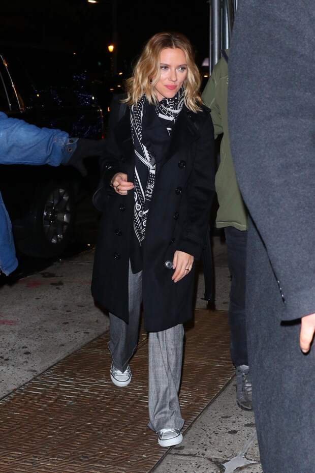 На красных дорожках Скарлетт Йоханссон всегда блистает в роскошных нарядах в сочетании с изящными туфлями на шпильке, но для вечеринок в узком кругу друзей она предпочитает более комфортные образы. На ужин с женихом и знакомыми Скарлетт спешила в классическом темном пальто и серых свободных брюках.
