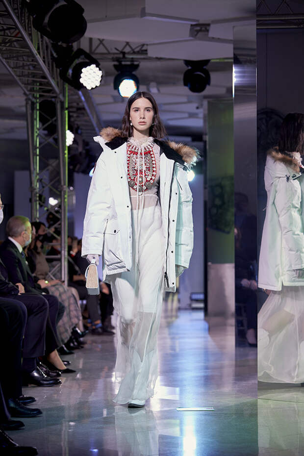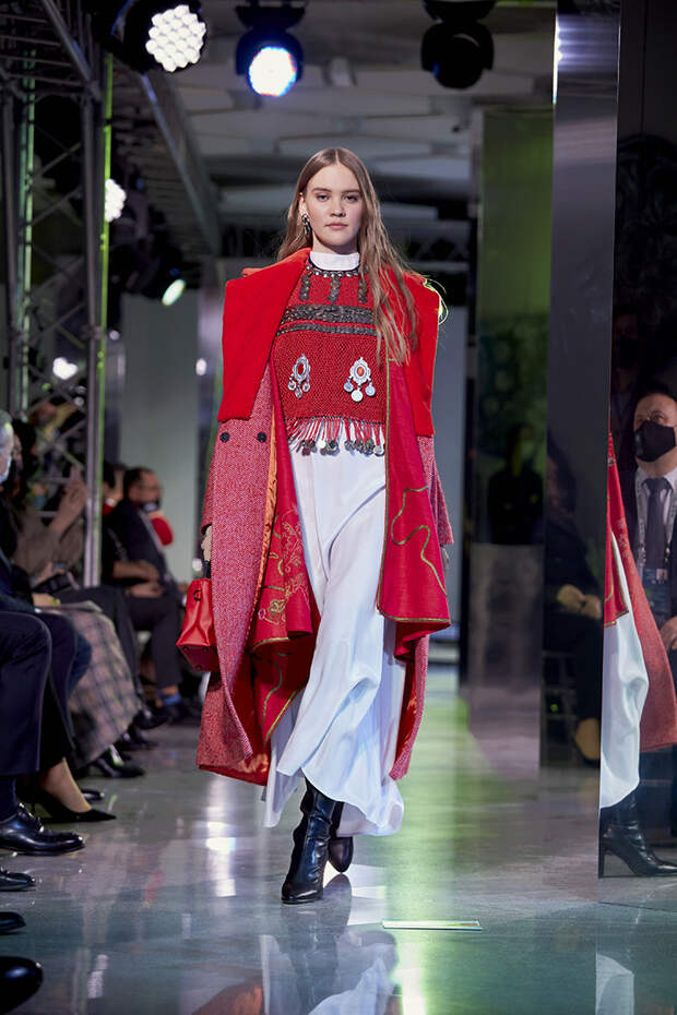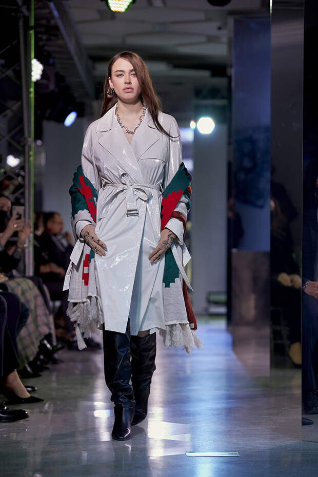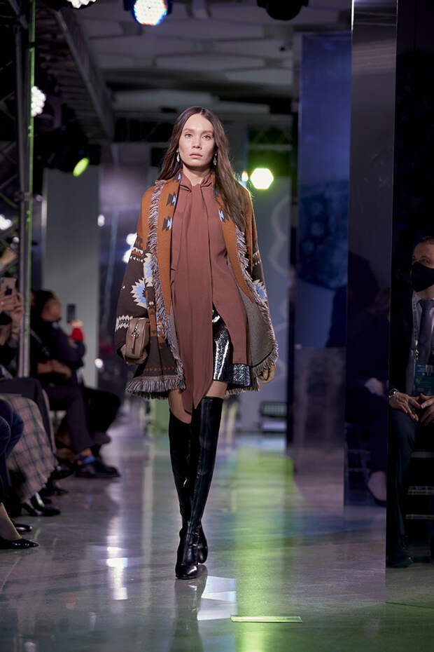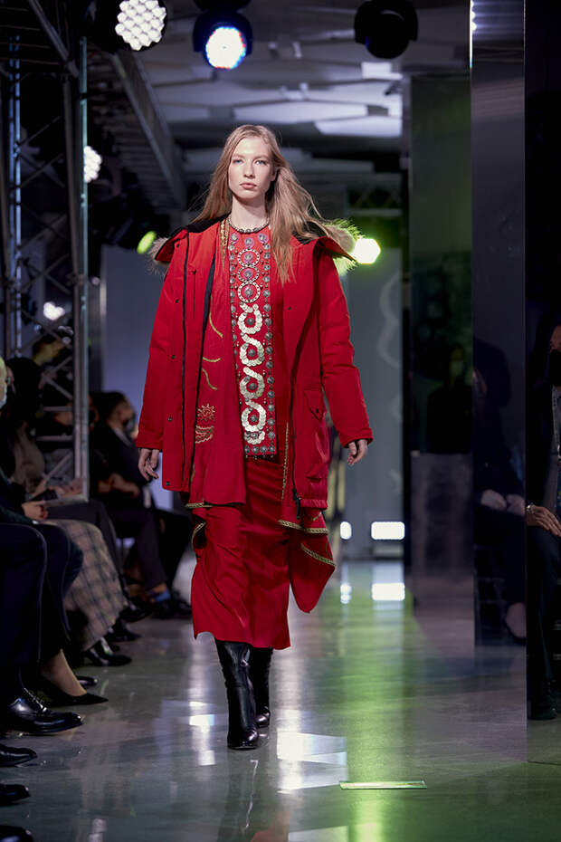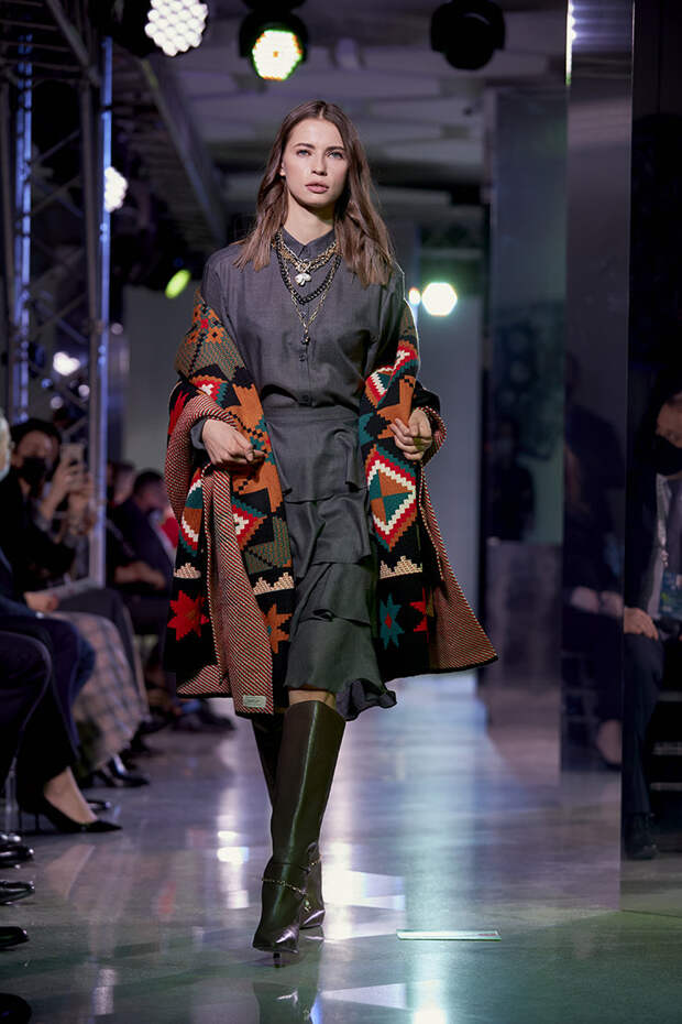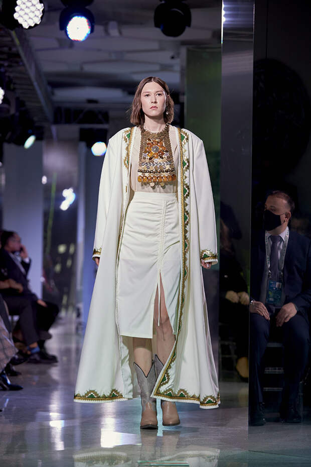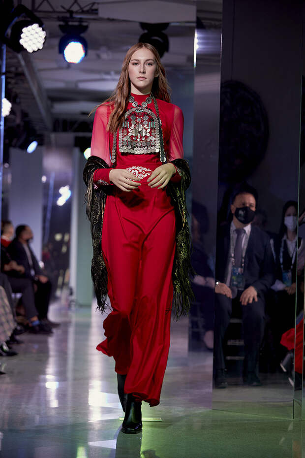 Модели продемонстрировали образы, которые были составлены из вещей московских и локальных дизайнеров: на подиуме можно было увидеть широкие брюки, воздушные накидки из полупрозрачных материалов, юбки миди, блестящие платья, объемные пальто и куртки, которые удачно сочетались с нагрудниками, расшитыми монетами, кардиганами с национальным принтом и этническими украшениями.