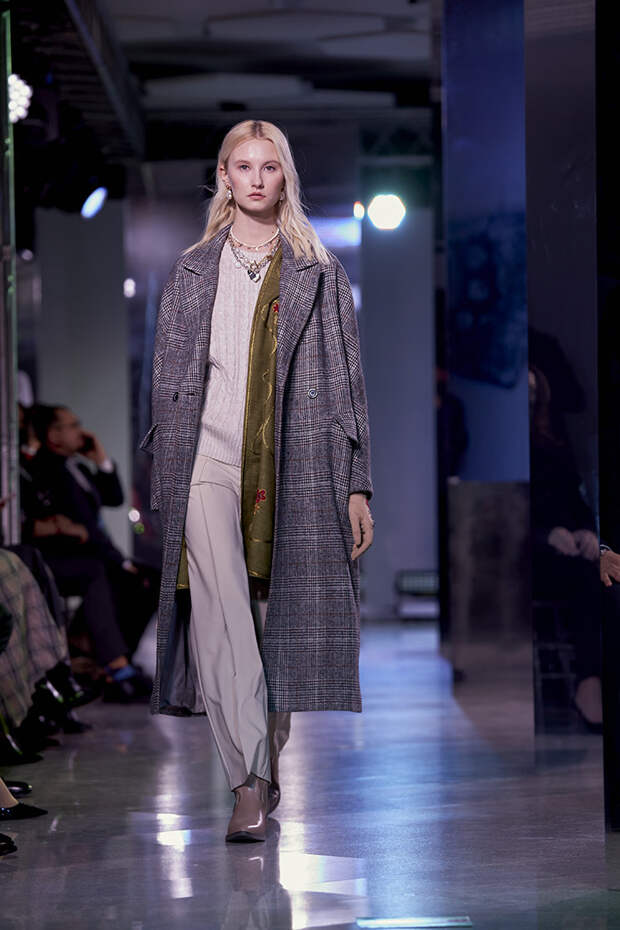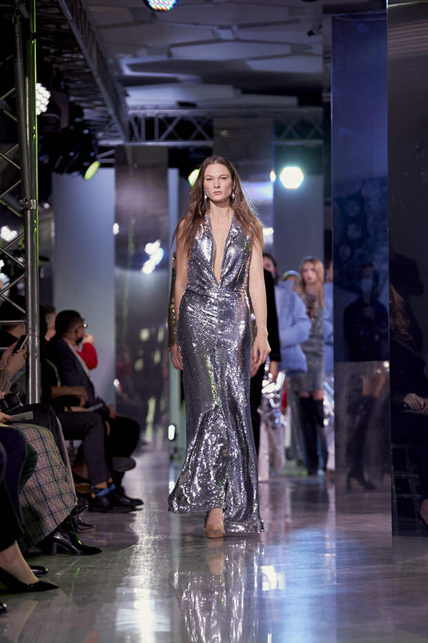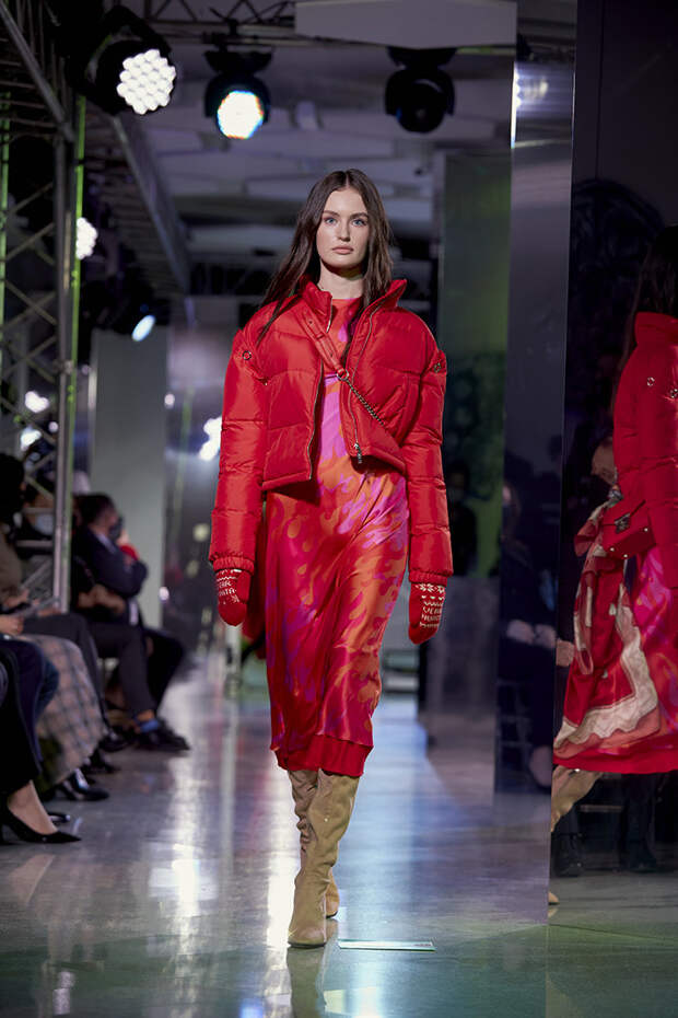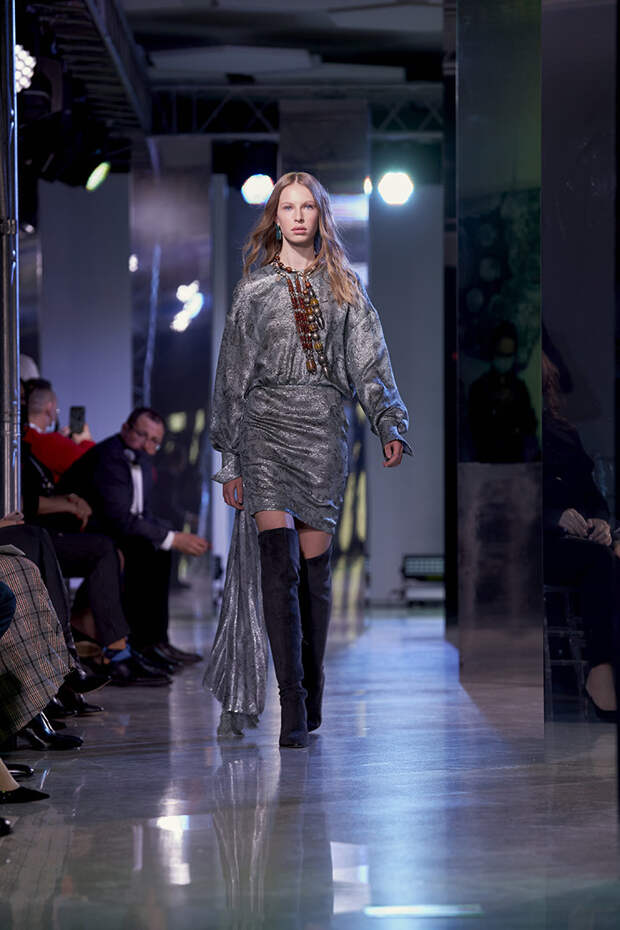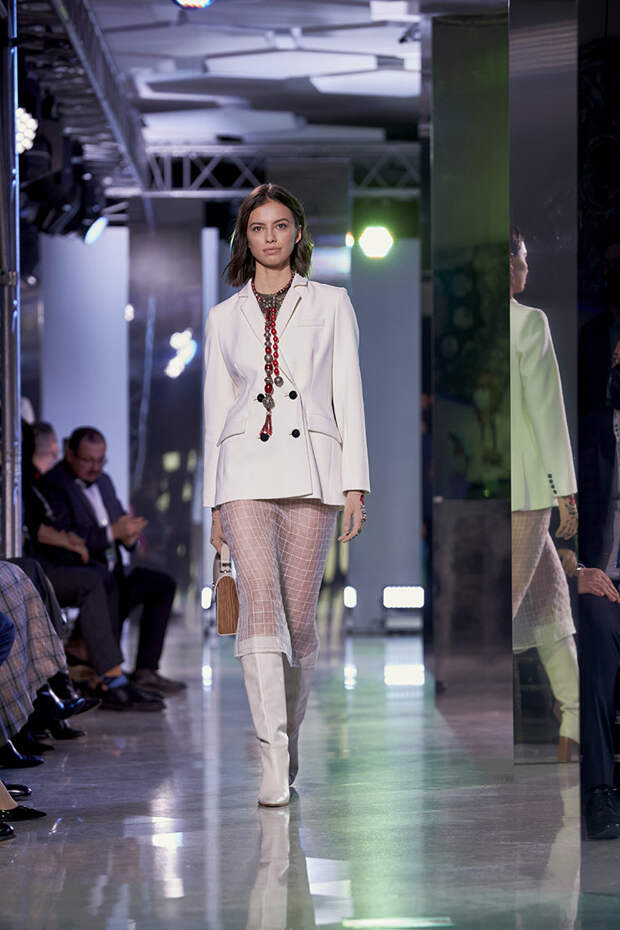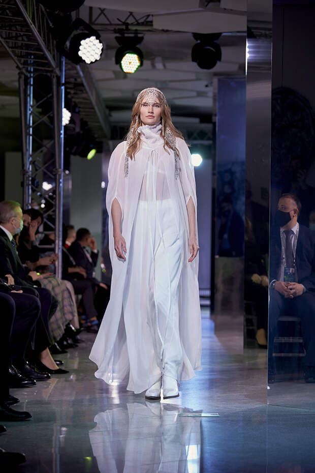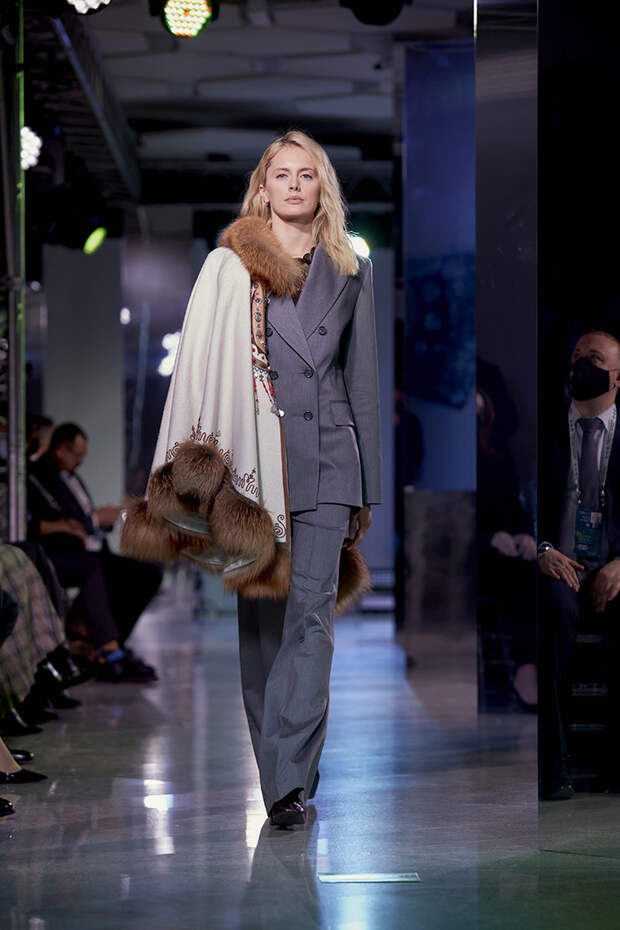 Модели продемонстрировали образы, которые были составлены из вещей московских и локальных дизайнеров: на подиуме можно было увидеть широкие брюки, воздушные накидки из полупрозрачных материалов, юбки миди, блестящие платья, объемные пальто и куртки, которые удачно сочетались с нагрудниками, расшитыми монетами, кардиганами с национальным принтом и этническими украшениями.