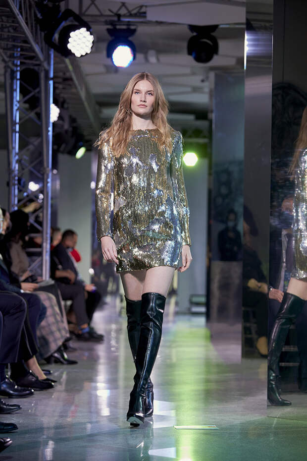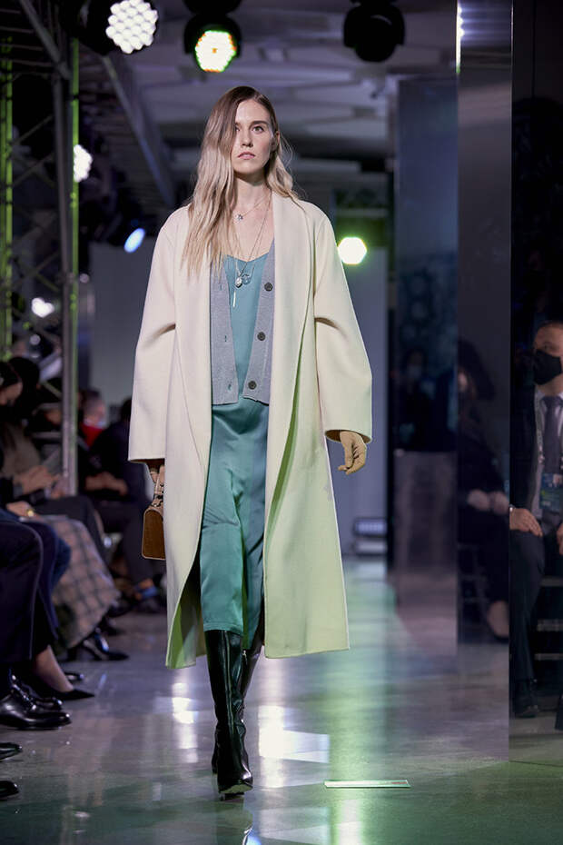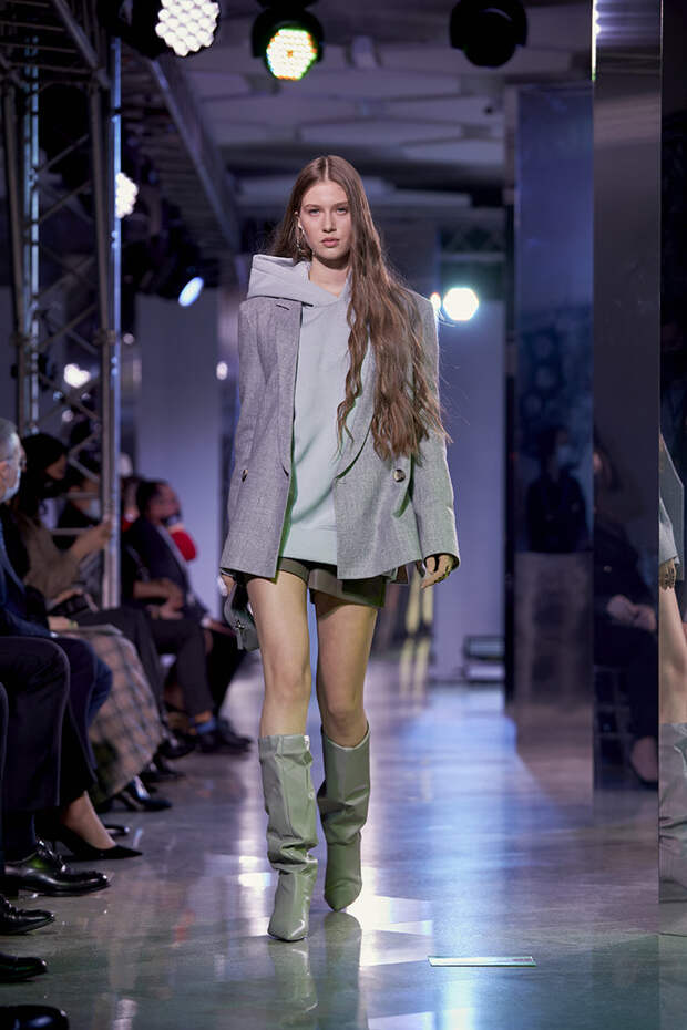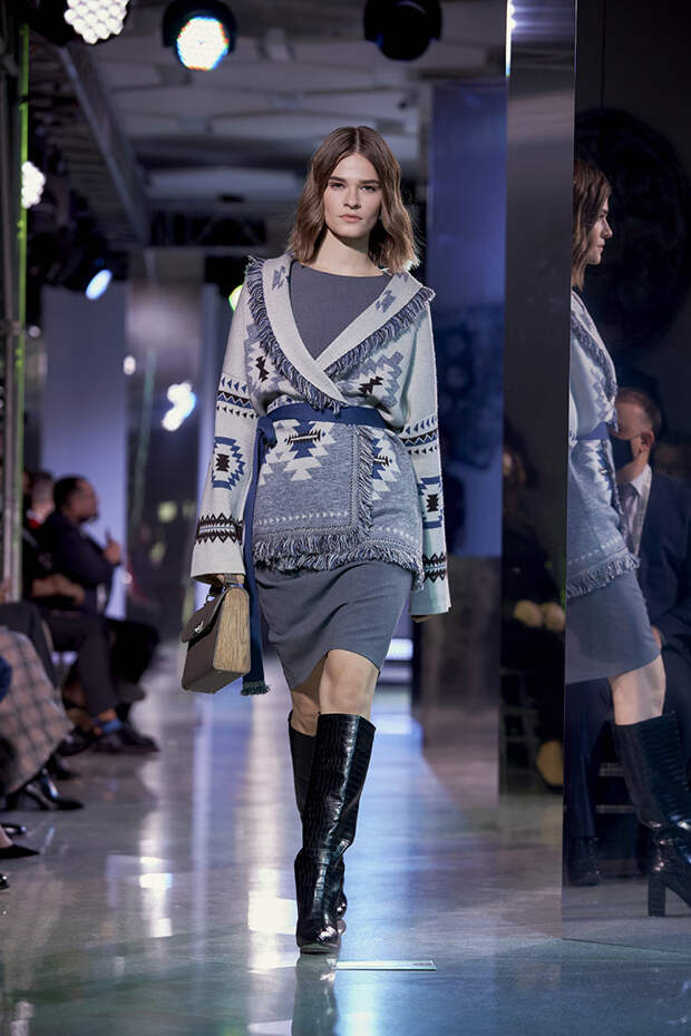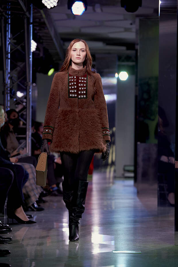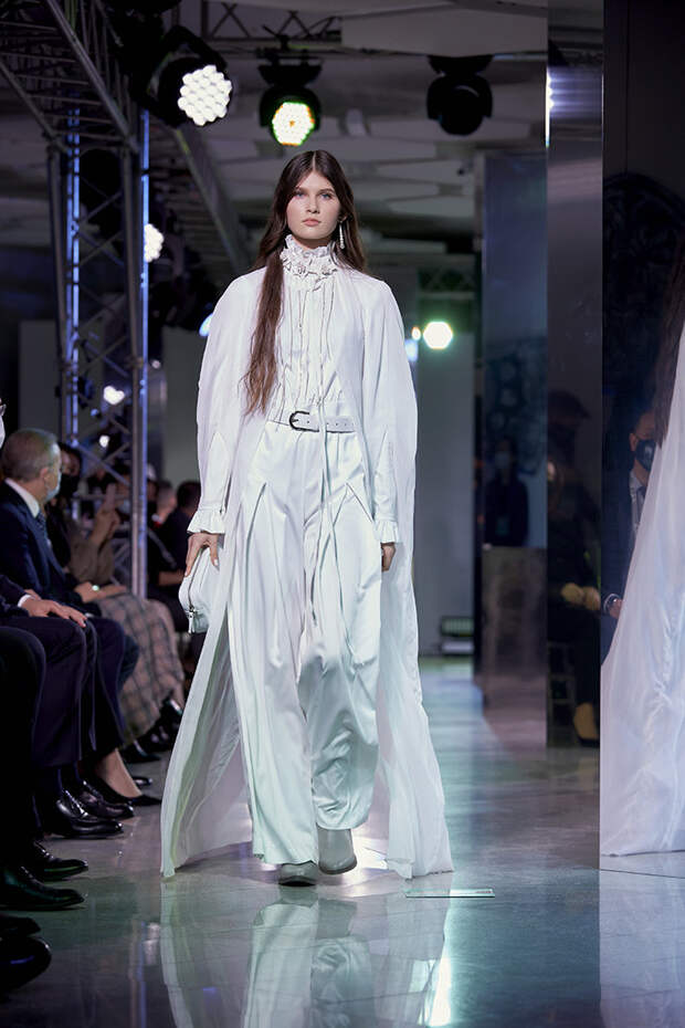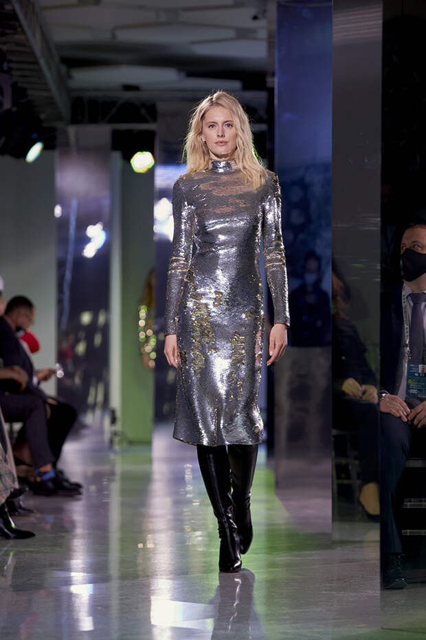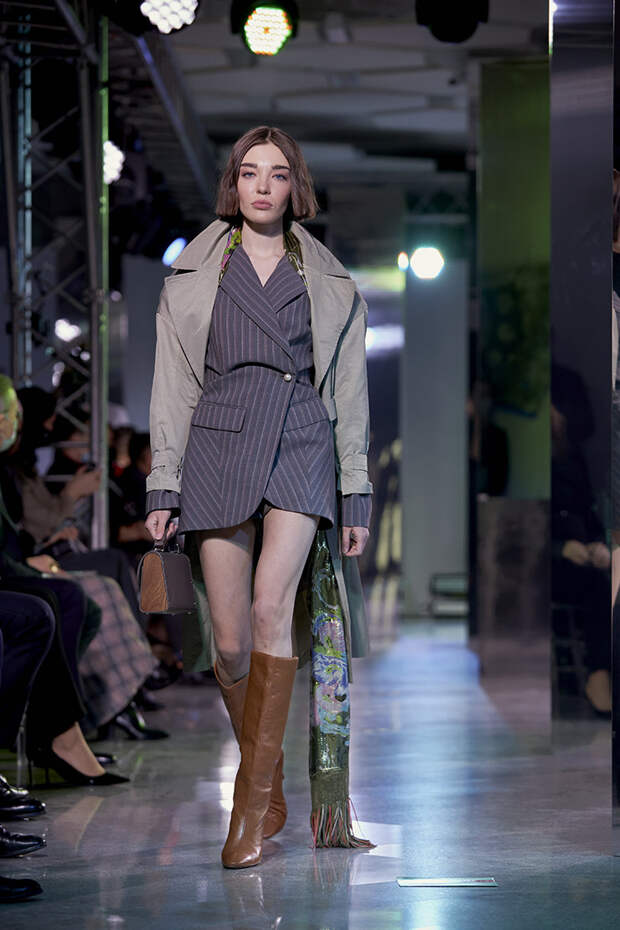 Модели продемонстрировали образы, которые были составлены из вещей московских и локальных дизайнеров: на подиуме можно было увидеть широкие брюки, воздушные накидки из полупрозрачных материалов, юбки миди, блестящие платья, объемные пальто и куртки, которые удачно сочетались с нагрудниками, расшитыми монетами, кардиганами с национальным принтом и этническими украшениями.