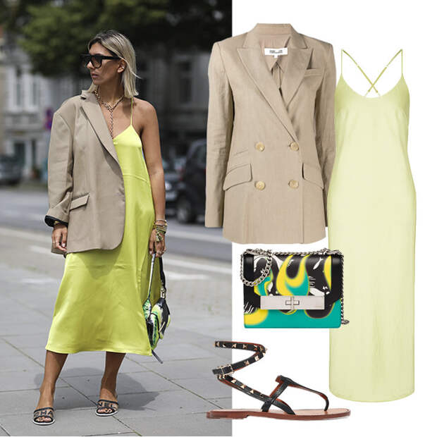 Платье ALEXANDERWANG.T, 24 500 руб.; блейзер DIANE VON FURSTENBERG, 35 960 руб.; сумка PRADA, 160 500 руб. сандали VALENTINO, 38 743 руб.