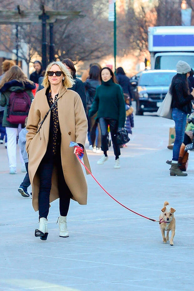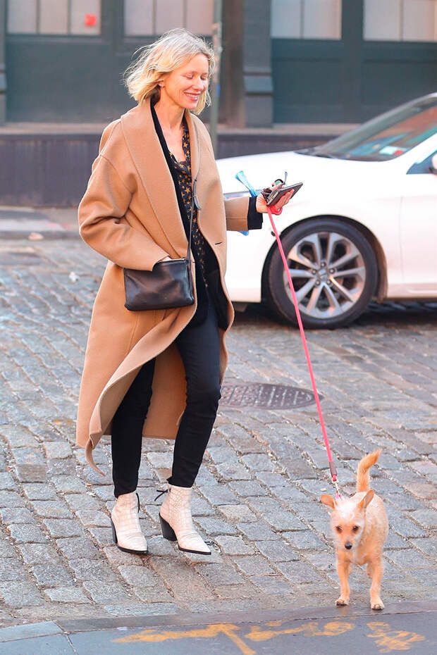 Повседневный образ не обаятельно должен быть скучным и состоять исключительно из черных вещей. Добавьте к любимому объемному пальто белые ботильоны и наряд сразу же преобразится. Во время недавней прогулки по Нью-Йорку Наоми Уоттс была замечена именно в них. Стоит отметить, что "змеиная" текстура обуви сделала лук еще более модным.
