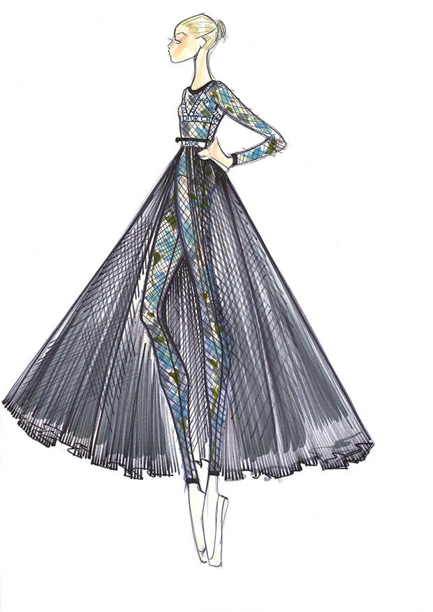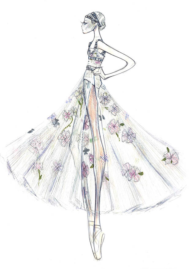 "Для меня создание этих костюмов превратилось в своего рода хореографическое упражнение. Главной целью было создать наряды, которые бы стали органичным продолжением движений в танце", - отмечает креативный директор Dior. И у нее это точно получилось! Приоткрывая завесу тайны, Dior показывают эскизы "балетной" коллекции. И это именно те рисунки, которые хочется поставить на заставку смартфона.
