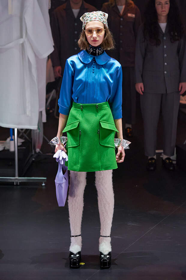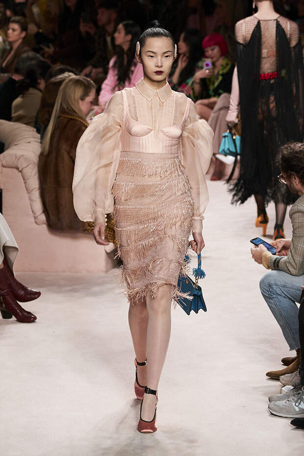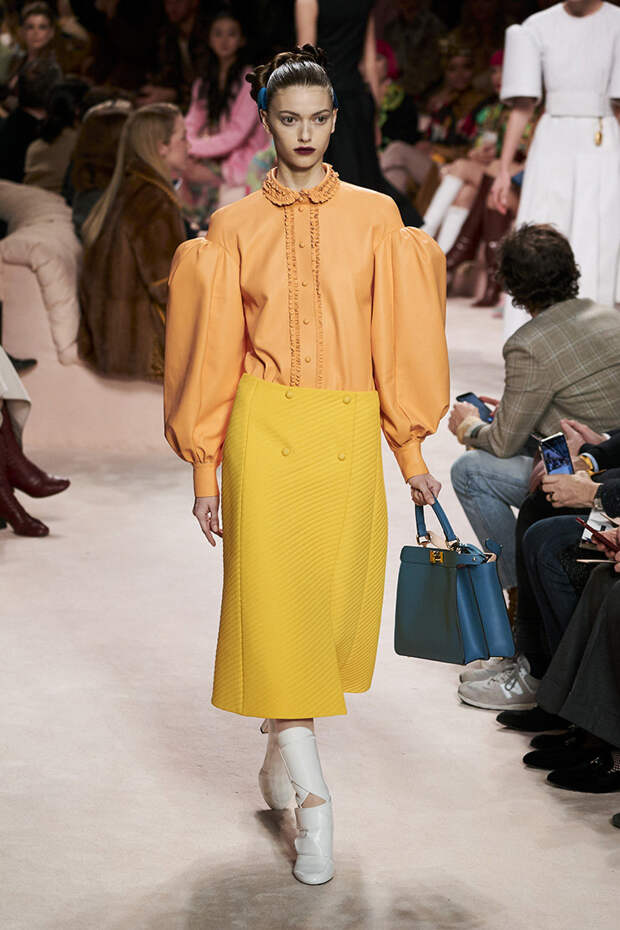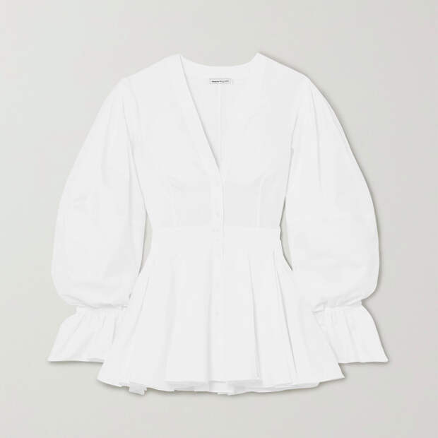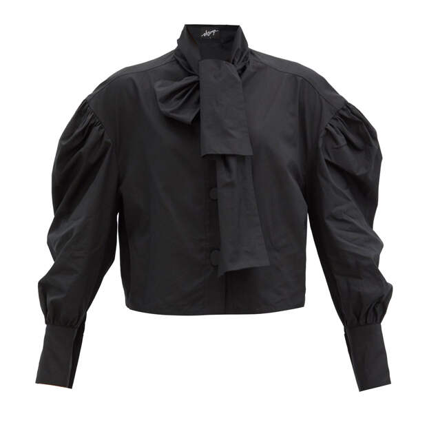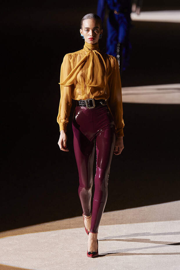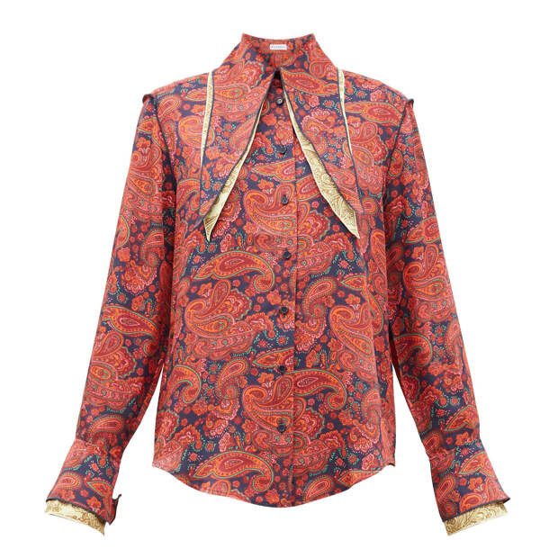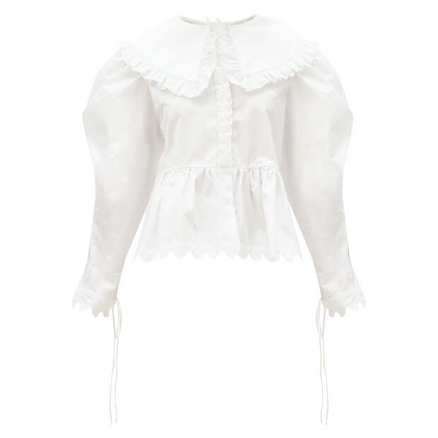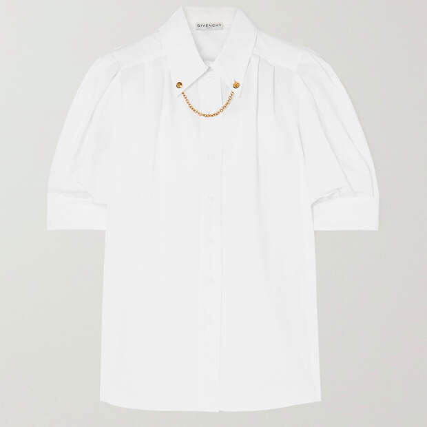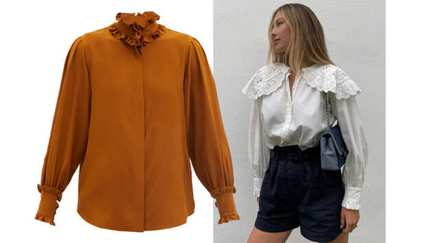 В новый сезон перешли и полюбившиеся этим летом всем модным инфлюенсерам воротнички - главным по ним стал бренд Ganni, у которого были представлены и свитера, и рубашки, и даже футболки с воротничками. Но такие "школьные" блузы можно найти не только у датского бренда - альтернативные варианты есть у Miu Miu и Horror Vacui. Конечно, самым масштабным трендом по-прежнему остаются объемные рукава - и чем больше, тем лучше - из самых разных тканей: и сексуальные полупрозрачные блузы из органзы, как у Dolce&Gabbana, и из хлопка, который будет уместно смотреться в повседневном кэжуал-луке, как у Alexander McQueen, и из нежного глянцевого атласа, как у Orseund Iris. Еще одна популярная тенденция, которая перекочевала из летнего сезона - всевозможные цепи на любом предмете гардероба, включая блузки - такую нестандартную модель с минималистичной цепочкой ищите у Givenchy.