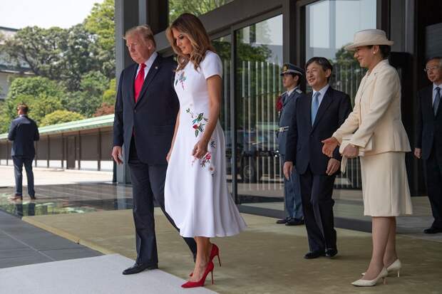 Мелания и Дональд Трамп прибыли в Токио, чтобы лично познакомиться с новым императором Нарухито и его супругой Масако. Президент США стал первым иностранным лидером, которого Нарухито принял в своем дворце. Первая леди выбрала для ответственного события лаконичный и строгий, но очень женственный наряд.