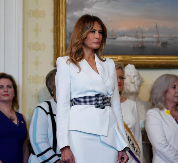 Дональд и Мелания Трамп появились на торжественной церемонии по случаю столетней годовщины с момента, когда женщины Америки получили право голосовать. По этому случаю первая леди США выбрала белый тотал-лук из жакета и юбки.