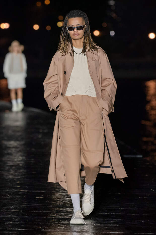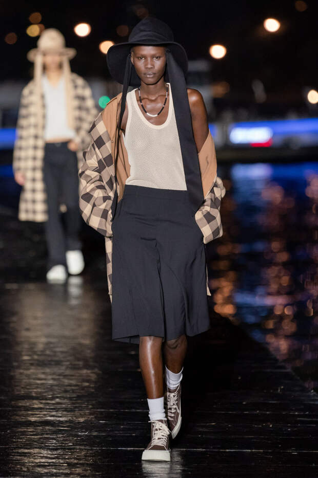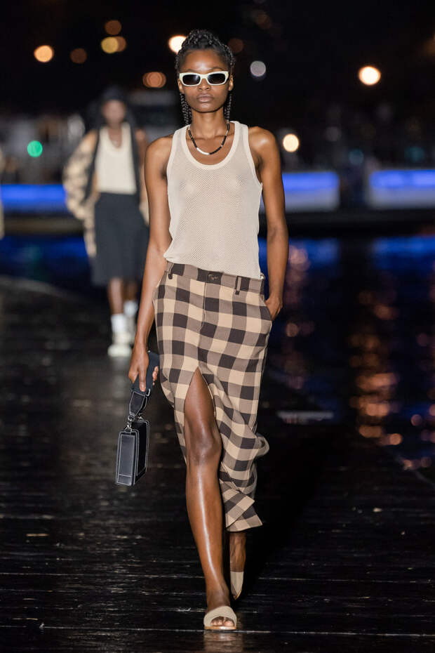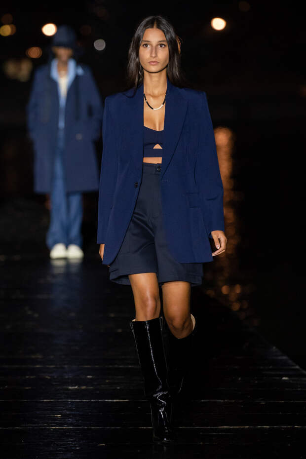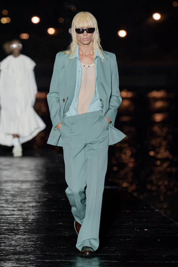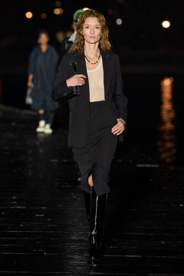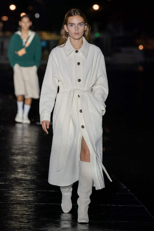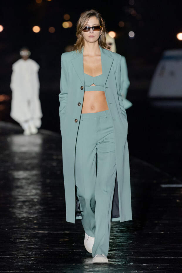 В него вошли 54 выхода — преимущественно монохромных и в спокойных оттенках (черный, синий, коричневый, беж, мята). Единственный принт на все шоу — бежевая и голубая клетка виши, из которой сделаны рубашки, плащи и пара юбок. Все остальное оставлено однотонным — чтобы не смазывать впечатления и не рассеивать внимание зрителей. Отдельного внимания заслуживают плотные шерстяные макси-платья (такие переживут весенний сезон и благополучно отправятся с вами в осень) и укороченные кожаные куртки слегка угловатого кроя boxy cut.