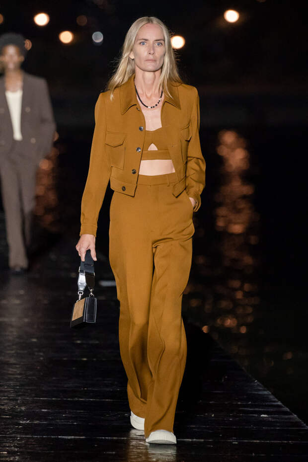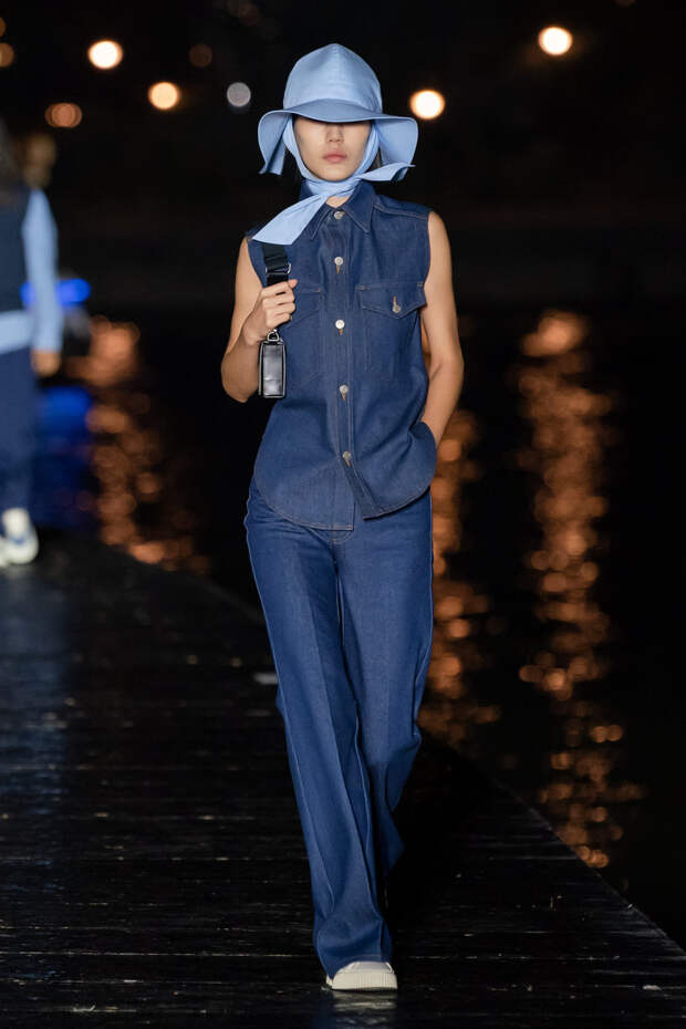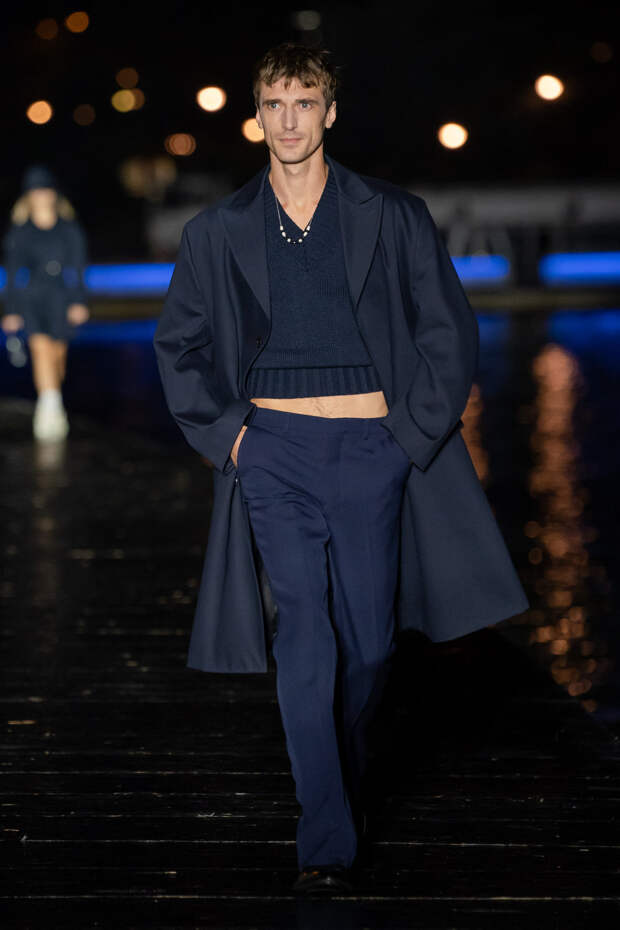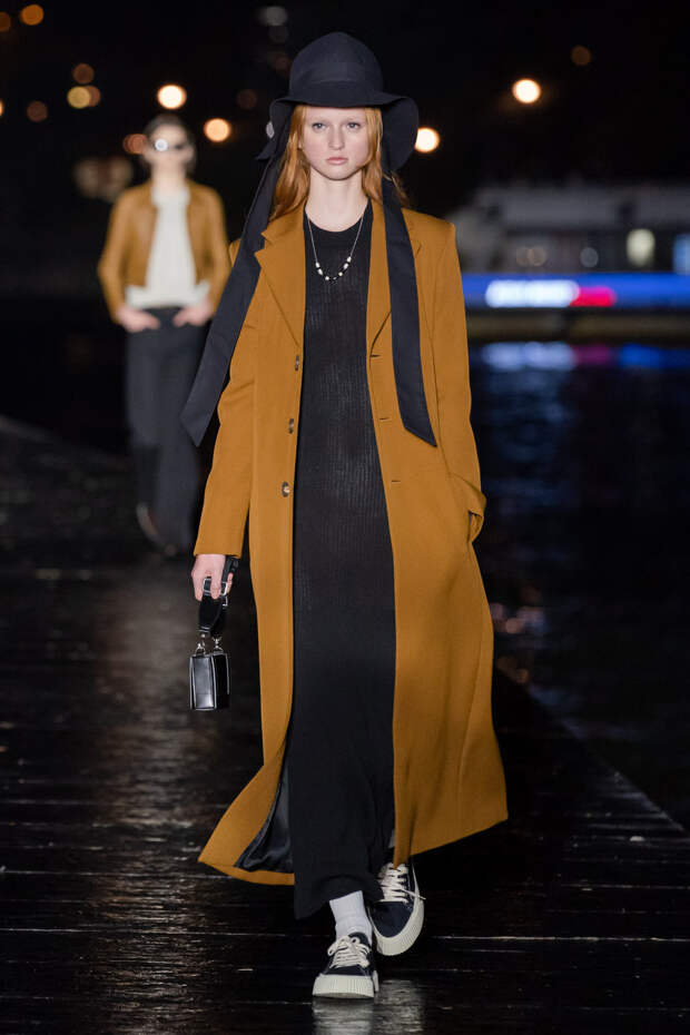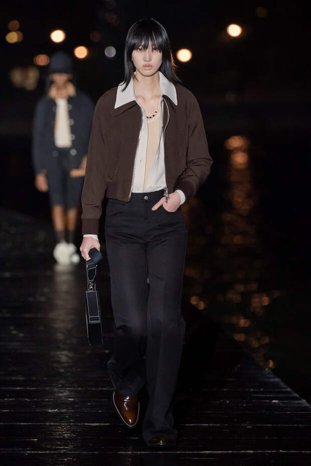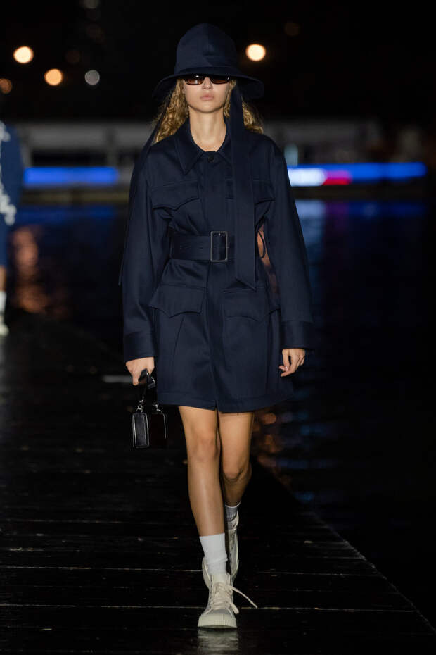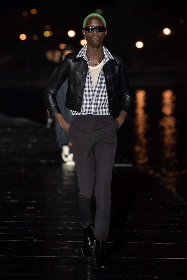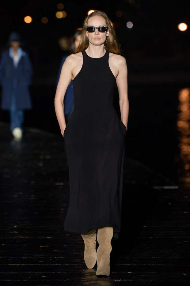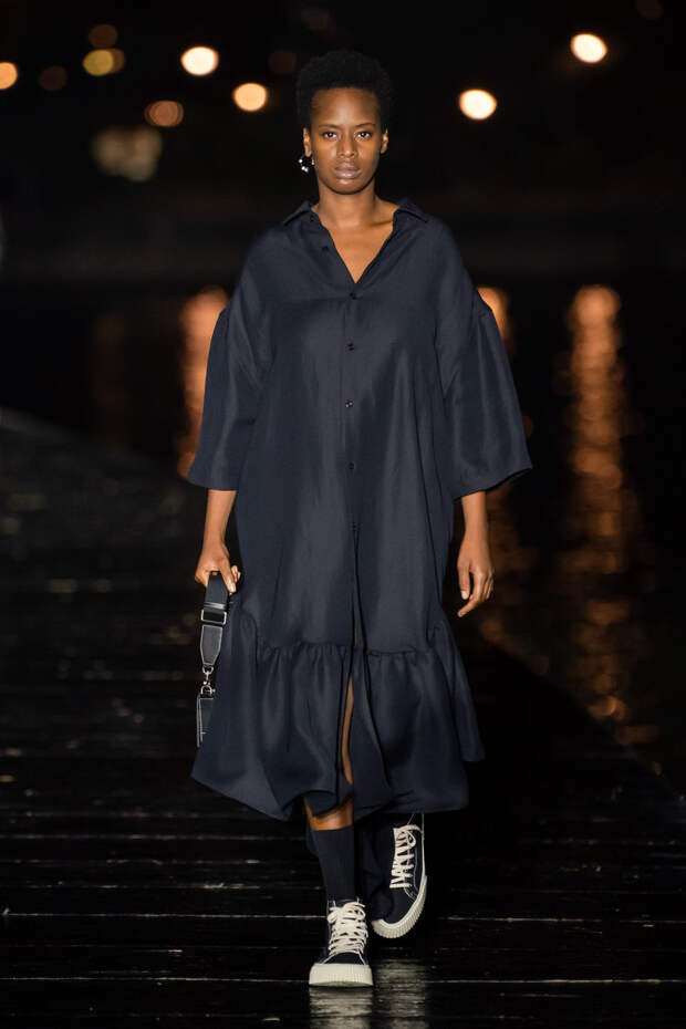 В него вошли 54 выхода — преимущественно монохромных и в спокойных оттенках (черный, синий, коричневый, беж, мята). Единственный принт на все шоу — бежевая и голубая клетка виши, из которой сделаны рубашки, плащи и пара юбок. Все остальное оставлено однотонным — чтобы не смазывать впечатления и не рассеивать внимание зрителей. Отдельного внимания заслуживают плотные шерстяные макси-платья (такие переживут весенний сезон и благополучно отправятся с вами в осень) и укороченные кожаные куртки слегка угловатого кроя boxy cut.