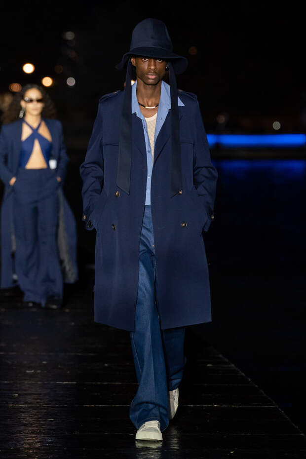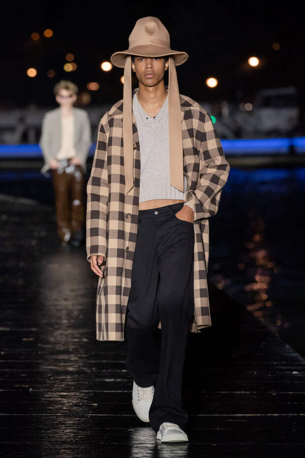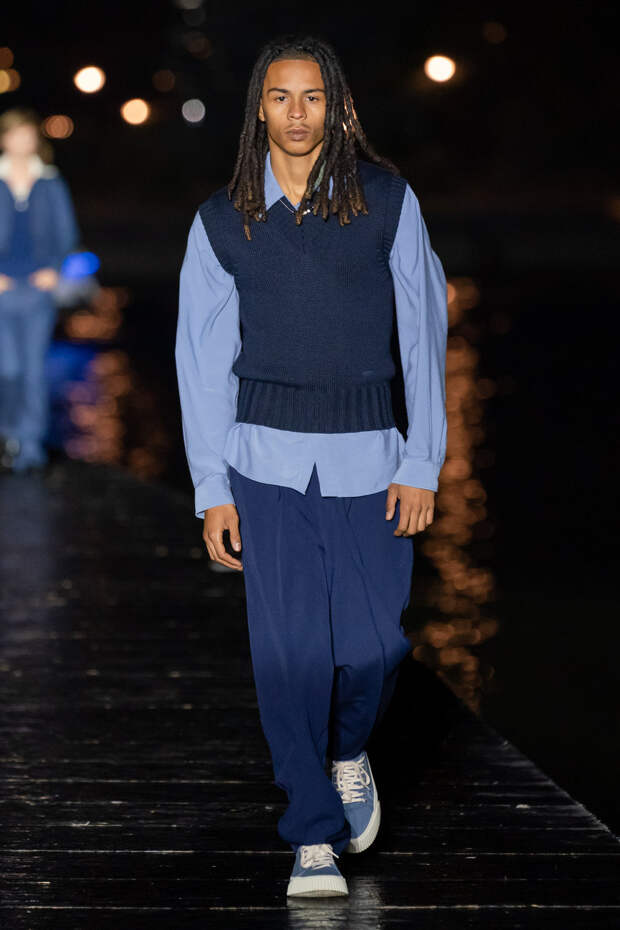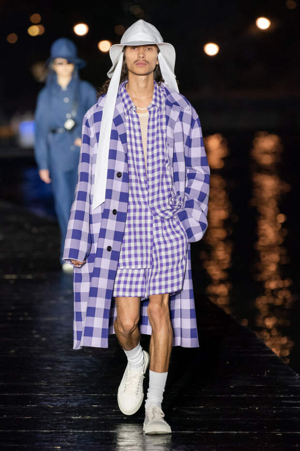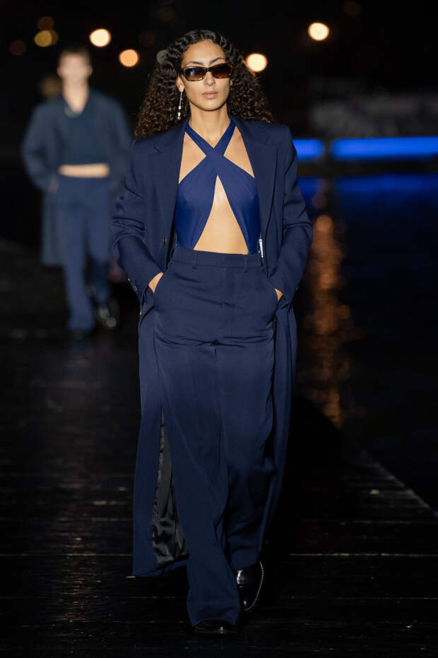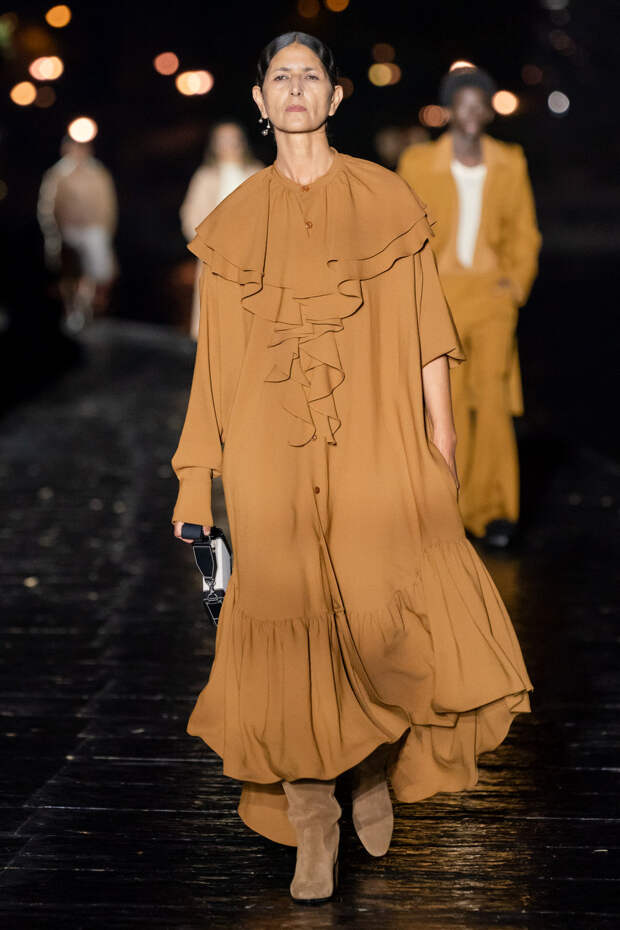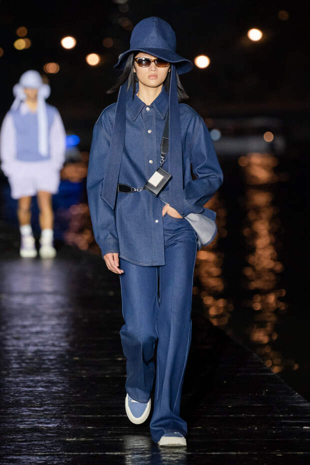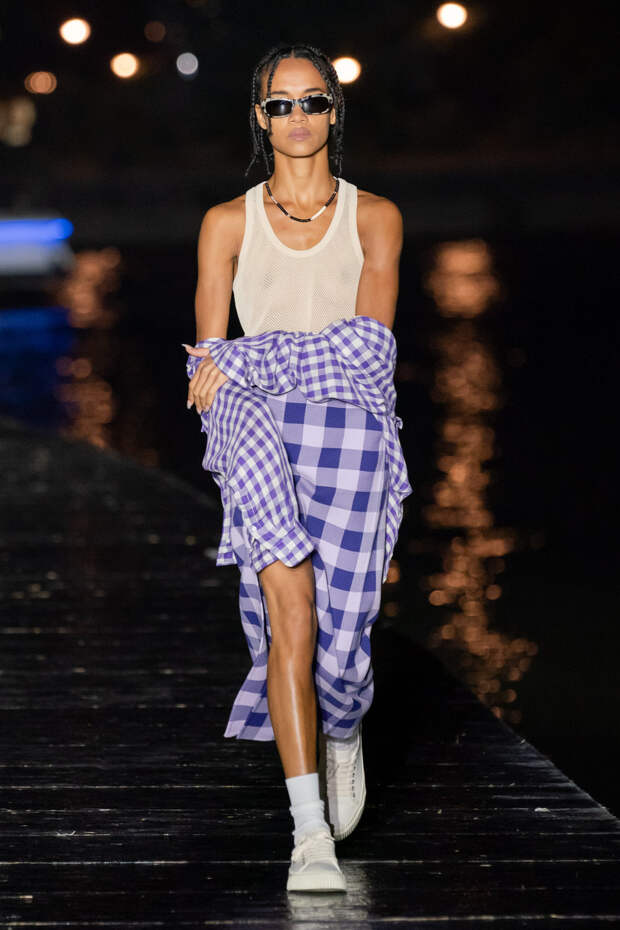 В него вошли 54 выхода — преимущественно монохромных и в спокойных оттенках (черный, синий, коричневый, беж, мята). Единственный принт на все шоу — бежевая и голубая клетка виши, из которой сделаны рубашки, плащи и пара юбок. Все остальное оставлено однотонным — чтобы не смазывать впечатления и не рассеивать внимание зрителей. Отдельного внимания заслуживают плотные шерстяные макси-платья (такие переживут весенний сезон и благополучно отправятся с вами в осень) и укороченные кожаные куртки слегка угловатого кроя boxy cut.