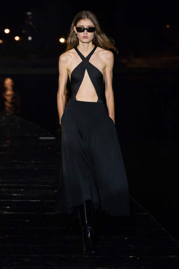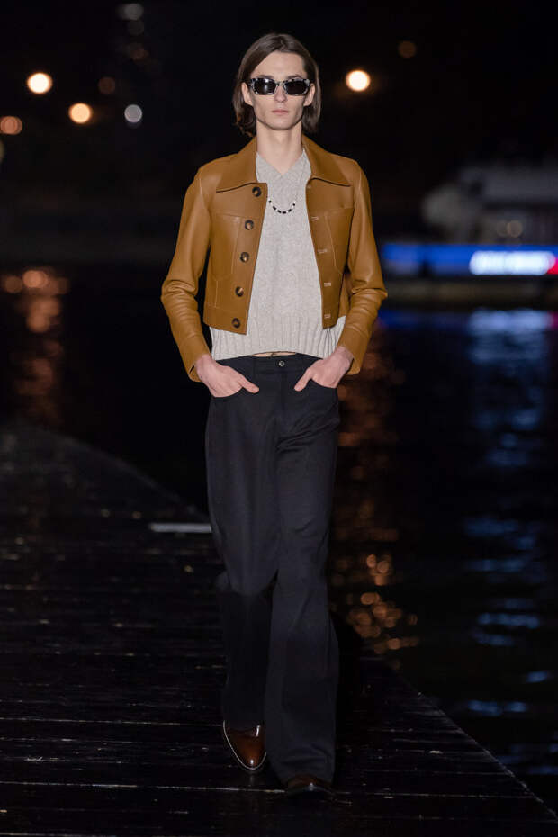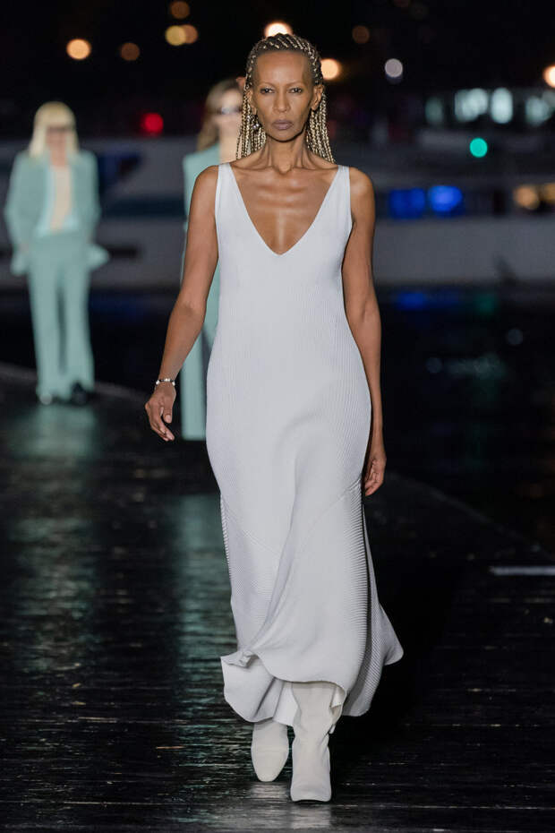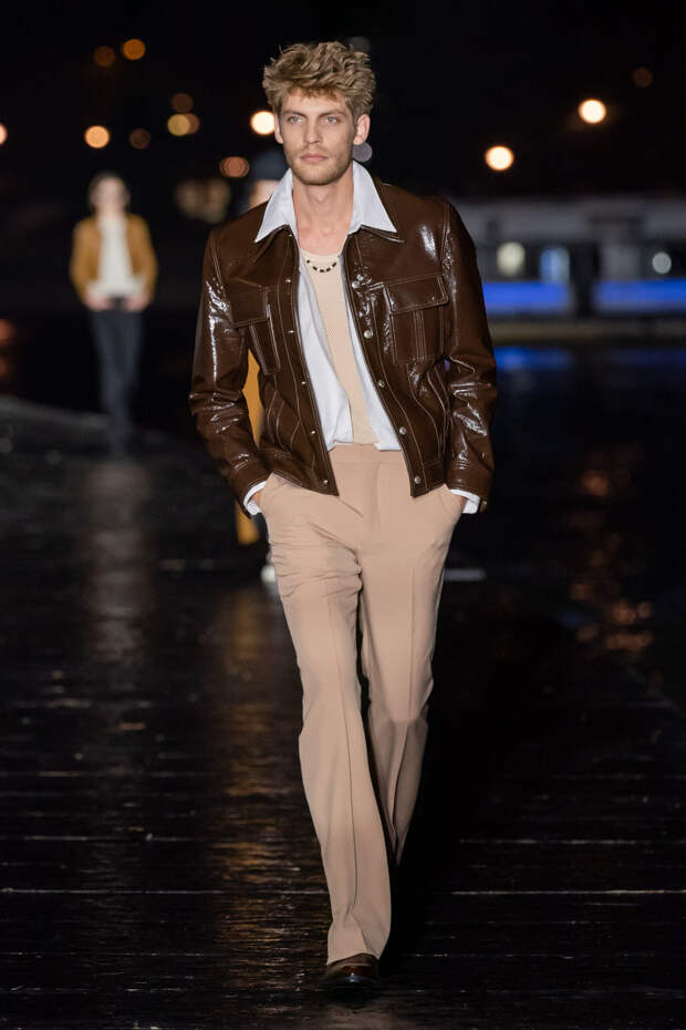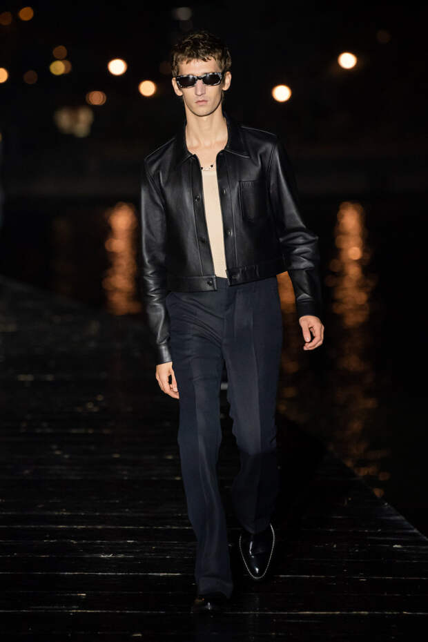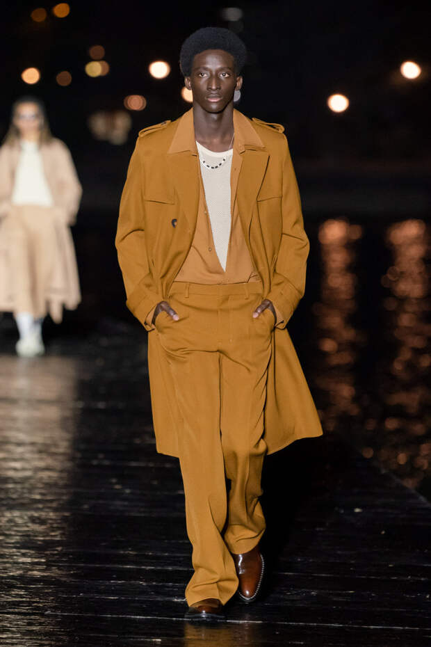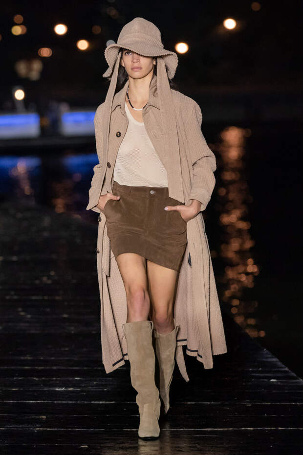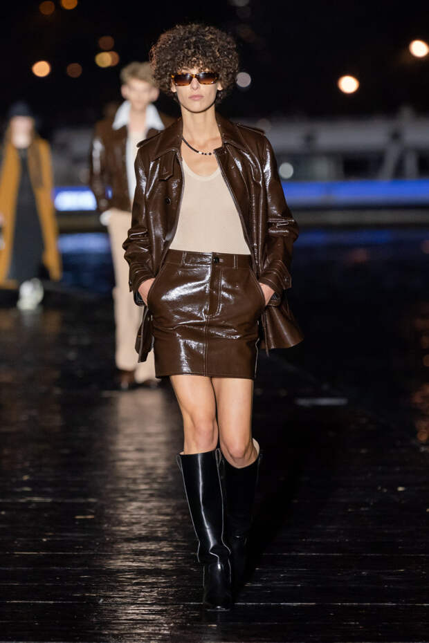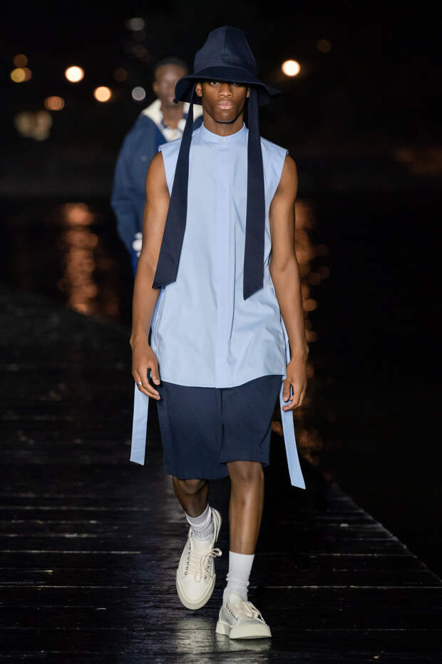 В него вошли 54 выхода — преимущественно монохромных и в спокойных оттенках (черный, синий, коричневый, беж, мята). Единственный принт на все шоу — бежевая и голубая клетка виши, из которой сделаны рубашки, плащи и пара юбок. Все остальное оставлено однотонным — чтобы не смазывать впечатления и не рассеивать внимание зрителей. Отдельного внимания заслуживают плотные шерстяные макси-платья (такие переживут весенний сезон и благополучно отправятся с вами в осень) и укороченные кожаные куртки слегка угловатого кроя boxy cut.