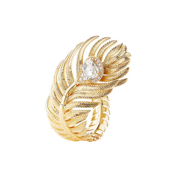 В нее вошли подвеска в виде перышка с бриллиантом огранки «роза» на тонкой цепочке и вторящие ей серьги, браслет и кольцо. Каждая часть перьев из желтого золота подвижна: особая техника литья позволила реалистично воссоздать их фактуру. Финальный штрих – пара колец из белого и розового золота, полностью покрытые бриллиантовым паве и нежно обвивающие палец.