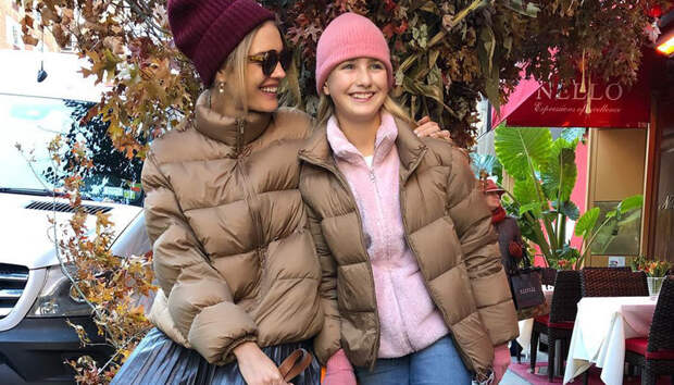 Топ-модель надела плиссированную юбку оттенка мокрый асфальт, замшевые ботильоны персикового оттенка на массивном каблуке и шапку-чулок модного в этом сезоне винного цвета. Наряд отлично дополнила дутая куртка до бедер в кофейном оттенке (точно такую же она приобрела и для своей дочери Невы). Прекрасный вариант, как одеться и красиво, и тепло.