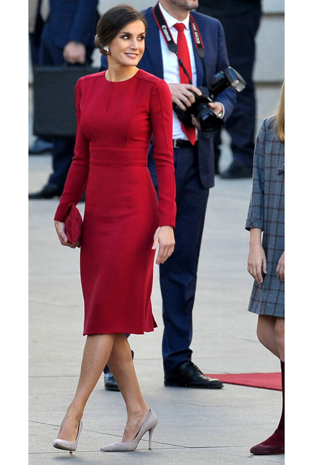Королева Летиция - одна из известных поклонниц "правила Виктории Бекхэм": как и дизайнер, монаршая особа обожает надевать туфли в тон сумке. Однако на этом супруга Филиппа VI не останавливается и ищет другие интересные способы сочетать цвета в нарядах. Например, 6 декабря она предстала перед публикой в алом платье-футляре, к которому подобрала клатч абсолютно в том же оттенке. А вот обувь предпочла телесную - изящные классические лодочки, без которых сложно представить королевский гардероб.