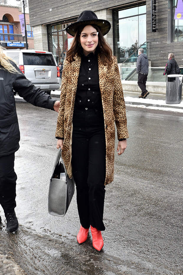 Прибыла на фестиваль Энн эффектно: в широкополой шляпе, леопардовом пальто и красных котильонах. Нам нравится такое комбо.