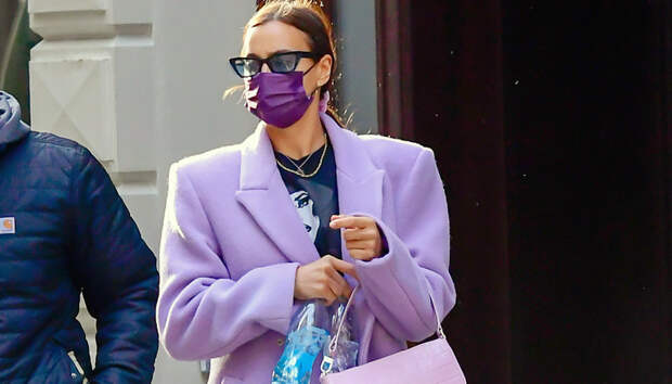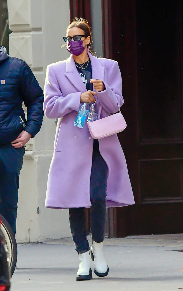 Ирина обратила внимание на один из самых популярных оттенков последних сезонов — лавандовый. И это идеальный выбор для межсезонья — одновременно нежный и заметный. Модель решила сыграть на контрастах, выбрав пальто в таком изящном пастельном оттенке — но с массивными маскулинными плечами. Таким образом, она поддержала тренд на акцентированные плечи в духе 80-х — но смягчила этот жесткий силуэт мягкостью выбранного тона. К такой заметной вещи она подобрала миниатюрную сумочку-багет в тон (одна из самых модных форм сезона) и белые ботинки челси, уже успевшие стать бесспорной классикой жанра. В остальном яркость образа была сбалансирована простыми черными скинни-джинсами и футболкой с принтом. Последний завершающий штрих — защитная маска насыщенного сливового оттенка. Все эти элементы вполне возможно включить и в свой гардероб — не стоит бояться ярких решений.